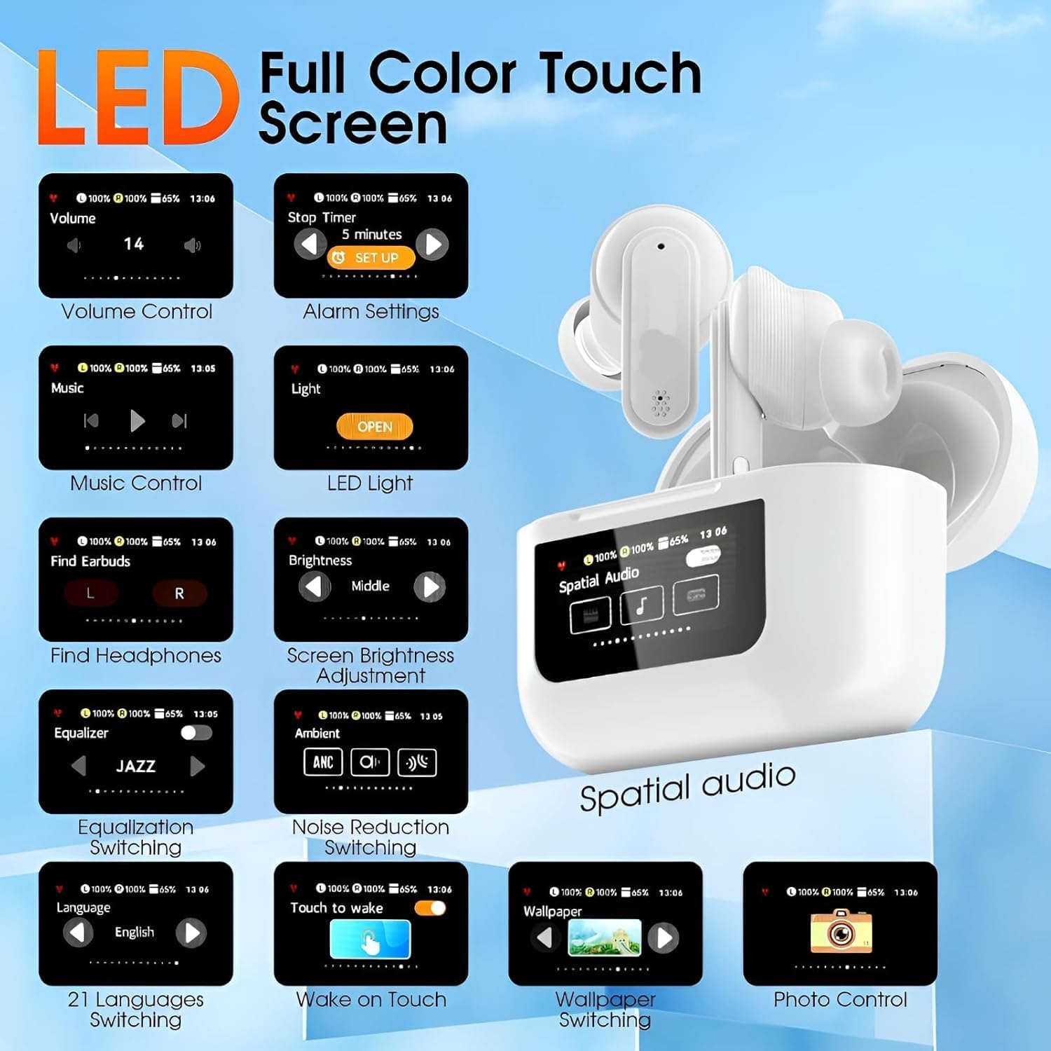 Unicornglazz Wireless Earbuds Bluetooth, Screen TWS, ANC (32dB), Smart Touch Display, Type-C Fast Charging, Bv5.4, Find My Earbuds, 4 Mics ENC for Clear Calling, Mode, EQ Mode, White