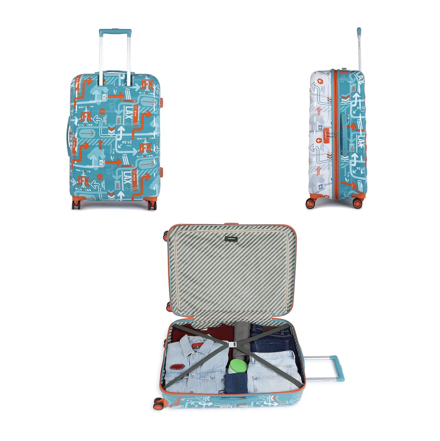 8-WHEEL TROLLEY BAG- Enhance your travel with ease using our stylishly printed check-in trolley bag for travel, boasting an innovative 8-wheel design for unparalleled mobility and stability. Glide through your journeys effortlessly, experiencing seamless movement.