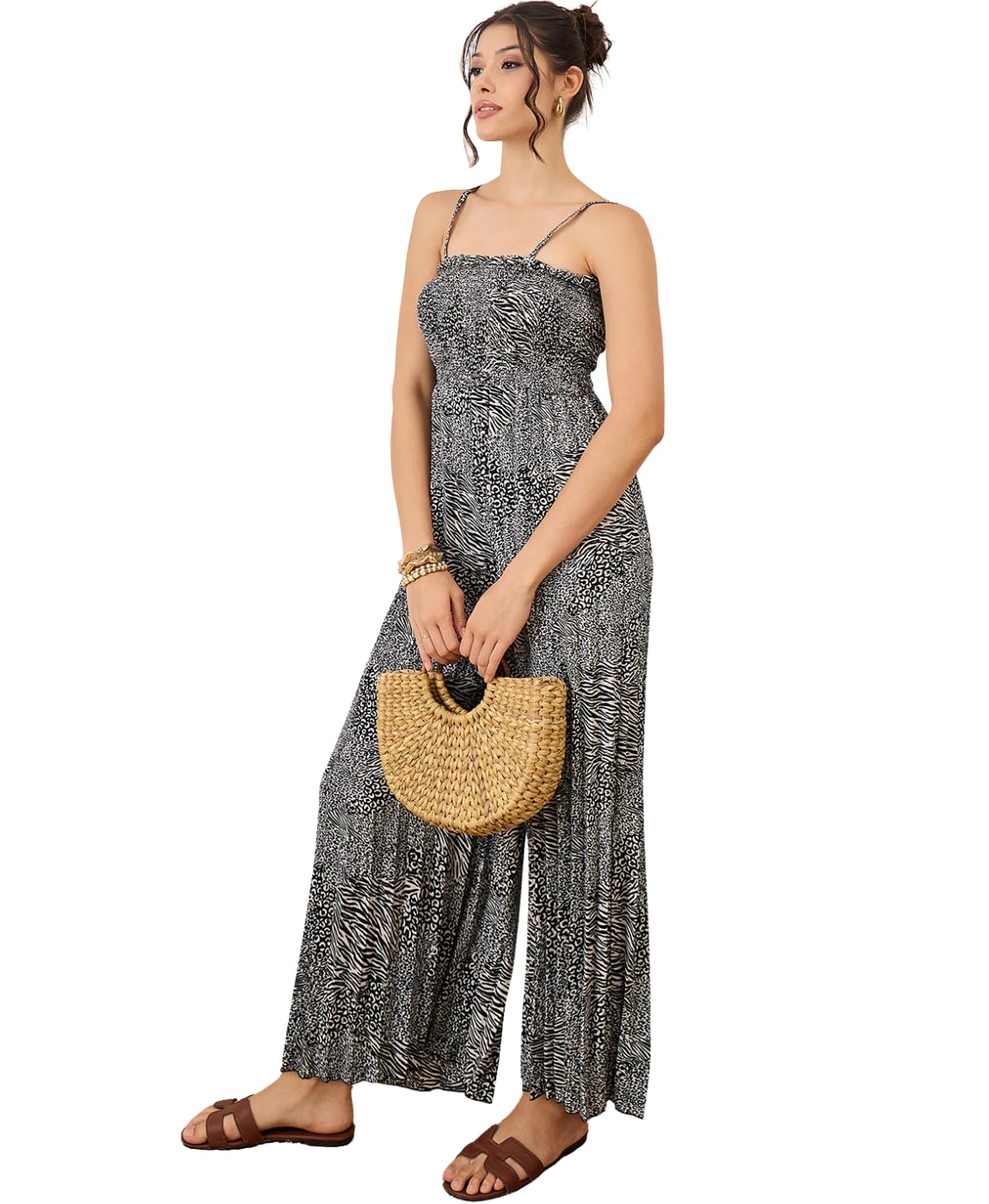 The pleated flared bottom expands and contracts as per the shape of your body. This fit and flare jumpsuit is comfortable, breathable and perfect for summers.