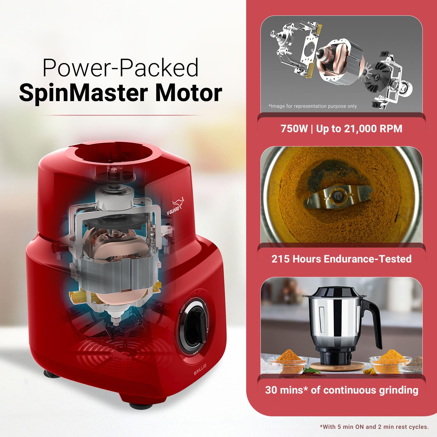 POWER-PACKED SPINMASTER MOTOR: The V-Guard Brillio Mixer Grinder boasts a 750 watt motor that has a speed of up to 21,000 RPM, ensuring quick and efficient grinding of various ingredients, making your cooking faster and more convenient.