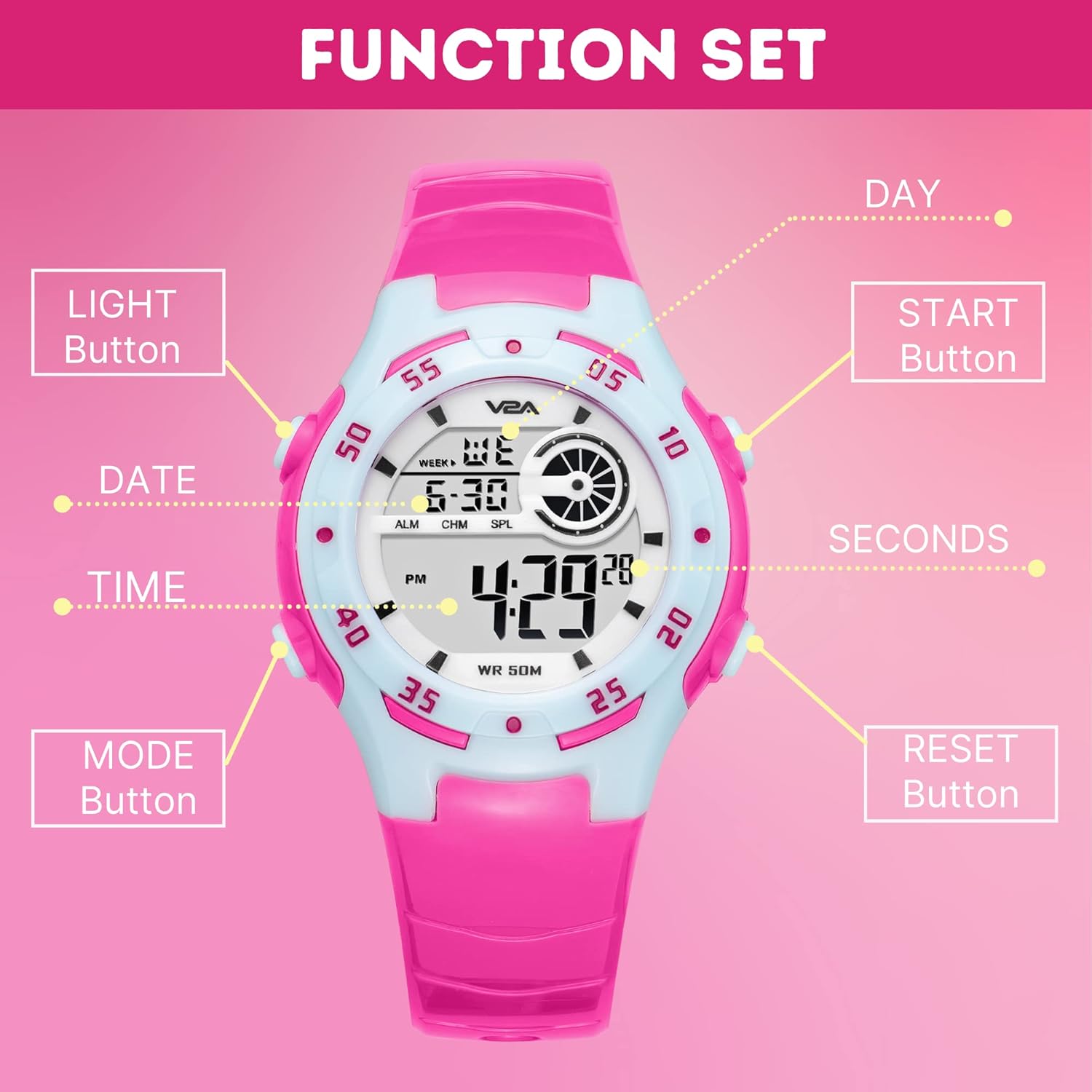 V2A Resin Digital 5Atm Waterproof Pink Sports Watch for Girls With Blue Dial