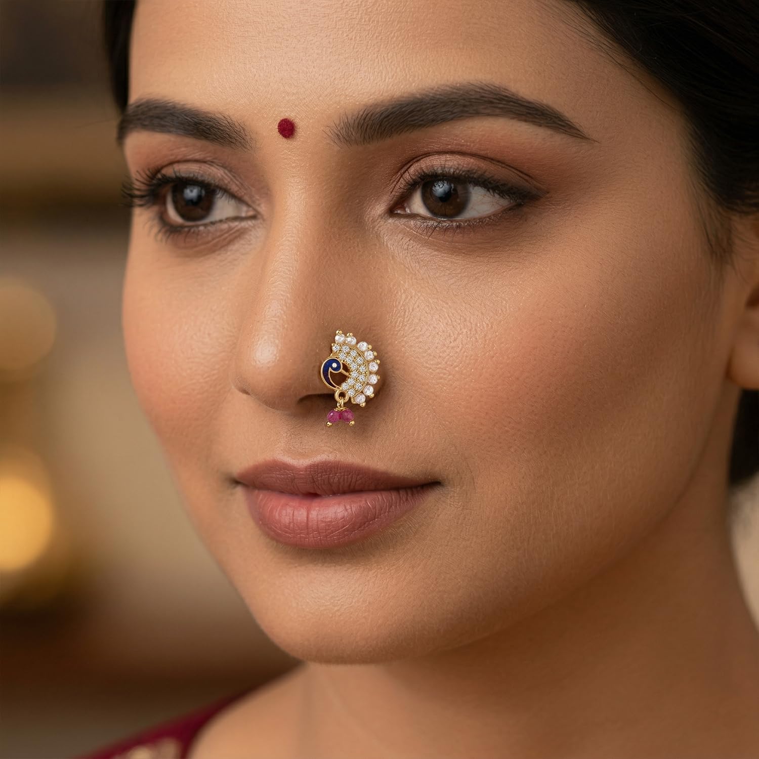 VAMA FASHIONS Gold Plated Peacock Design Maharastrian Marathi Nathni Pearl Nose Ring Pressing Nosepin Bridal Non Piercing Nath Nathiya Clip on Nosering For Women