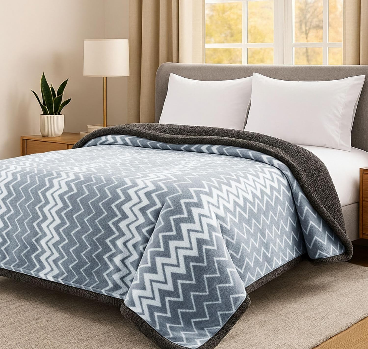 This fleece blanket is thicker than cotton and keeps you warm without being too heavy. Fleece is a suitable alternative to wool with comparable warmth.Stripe Design- Sherpa and flannel double Sided design one side is super soft sherpa fleece which is cozy and warm. The other side is flannel, different color and white stripe pattern with 3D touching offers you amazing senses of softne.