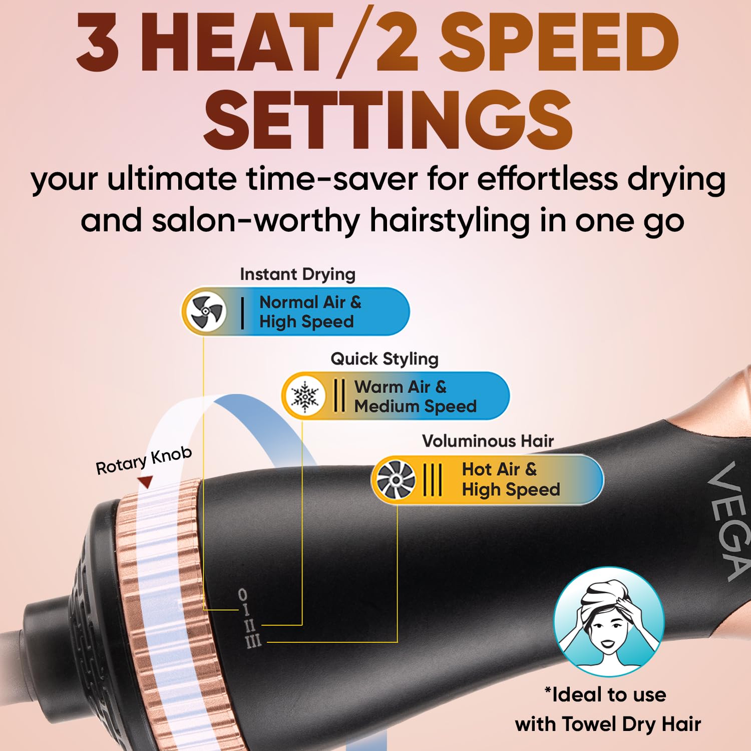VEGA Litstyle L3 Volumizer Hair Blow Dryer Brush With 3 Heat/2 Speed Settings,360° Airflow Vent,3 in 1 Compact Hot Air Brush For Women,Tourmaline Ceramic Coated Barrel 500 Watts,(VHSD-03),Multicolour