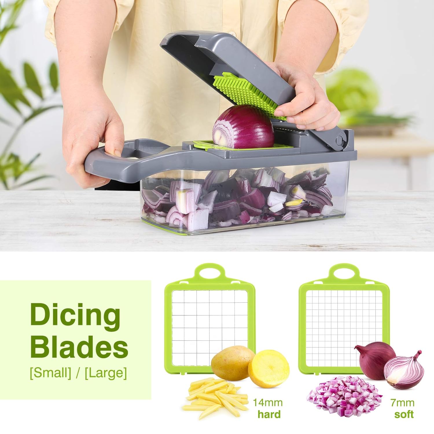 [Multi-functional Vegetable Chopper]: You will immediately get a 13-in-1 vegetable slicer and chopper. Our food chopper includes 6 interchangeable blades to meet your different needs. Also includes an egg separator, a large capacity container, molded finger guards, rubberized nonskid base and cleaning brush. To get a head start on food prep with a staple ingredient, an onion chopper is an essential small appliance.