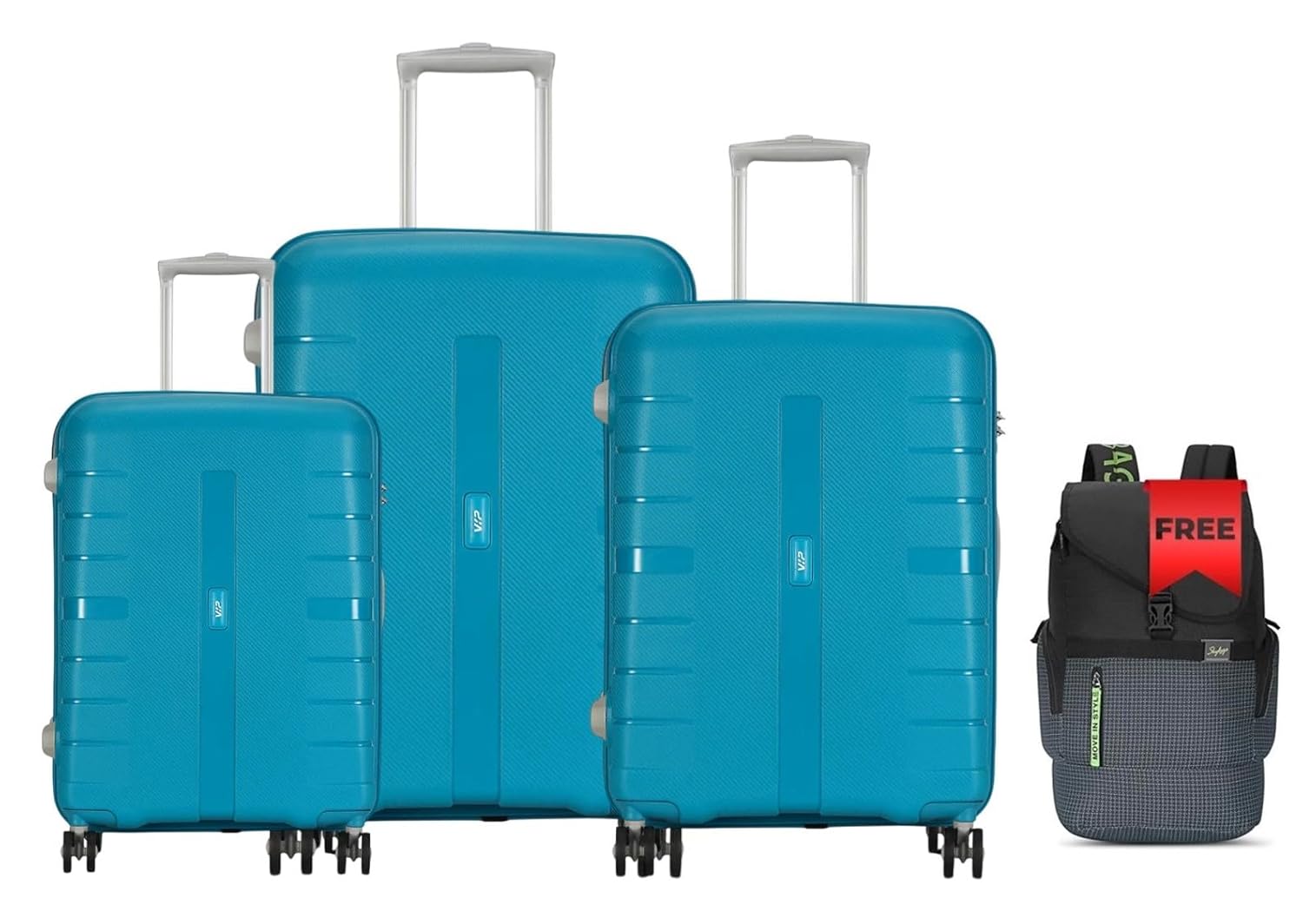 VIP Voyager Pro Polypropylene Hard-Sided Luggage Set of 3 (Cabin + Medium + Large) | 8 Dual Spinner Wheels | Built-in Lock | Lightweight Suitcase Set – Teal Blue with Free Skybags Backpack