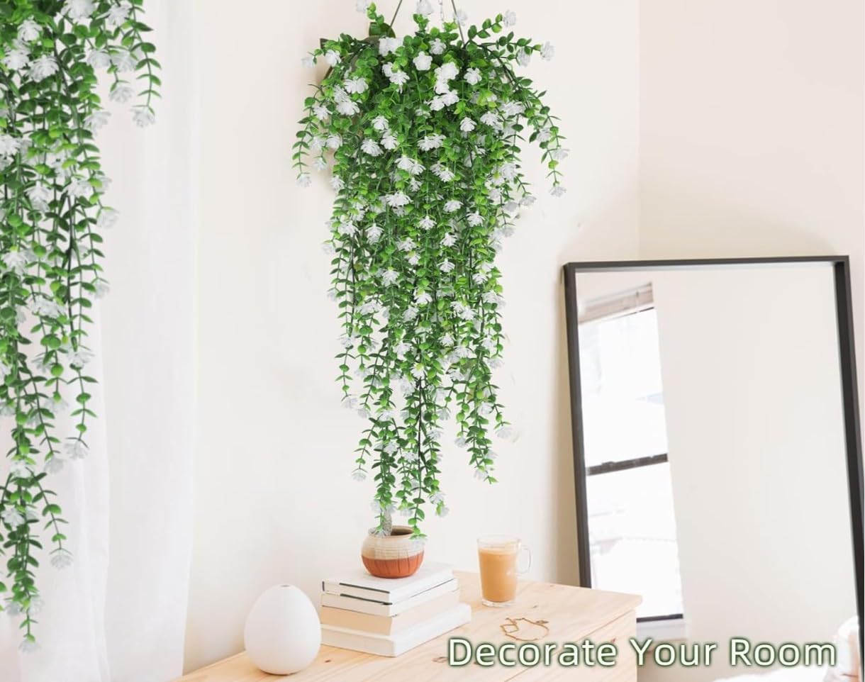 VRB Dec 2 Pcs Artificial Dry Baby’s Breath Greenery Hanging Plants Vines Fake Ivy Hanging Flowers Vine Wall Hanging for Home Decor,Wall,Balcony Decoration. (2, White Euclyptus Fern Hanging)