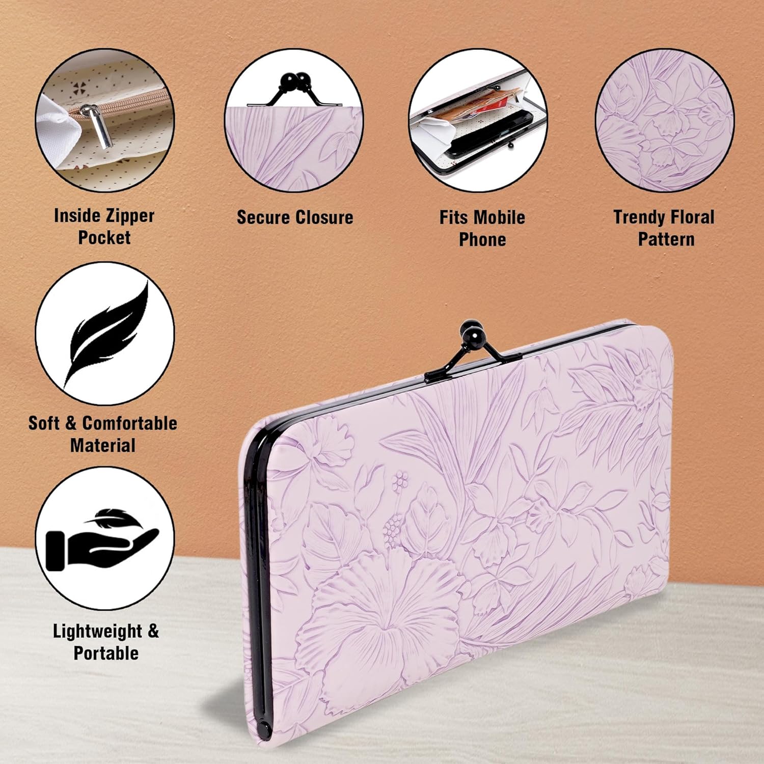 Discover the perfect blend of stylish and functionality with this elegant women’s wallet, designed for those who appreciate quality and convenience. Crafted from premium vegan leather with a beautiful multicolor floral print, this wallet is as durable as it is eye-catching. It features multiple card slots, a secure zip pocket, and a magnetic kiss lock for added safety, ensuring your essentials are well-organized and protected. This versatile hand clutch is an ideal companion for daily use, whether you’re heading to college, the office, shopping, or traveling. It offers ample space for your cash, cards, coins, and mobile phone, making it a must-have accessory for any occasion. Handcrafted in India, this lightweight and water-resistant wallet is a thoughtful gift for girls and ladies who value both style and practicality.