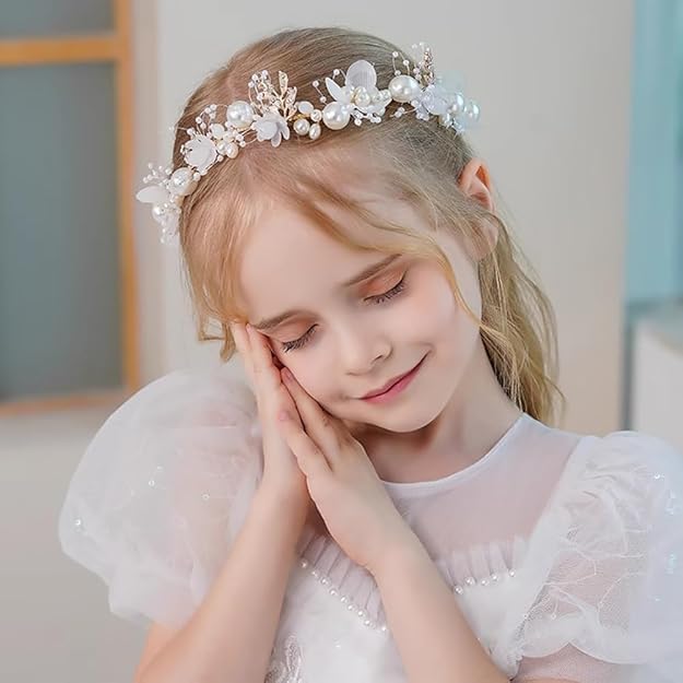Whimsical Crystal Pearl Hair Flower Girl Headband Princess Tiara for Kids Girls Women Bridal Floral Tiara Hairband for Wedding Party Dress Up Hair Accessories