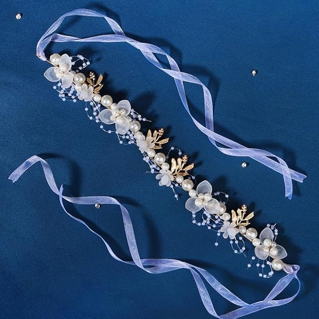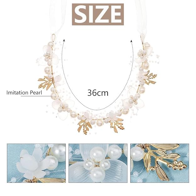 ELEGANT BRIDAL DESIGN: Handmade hair vine headband featuring delicate white flowers, lustrous pearls, and gold leaf accents creating a whimsical and romantic look perfect for weddings