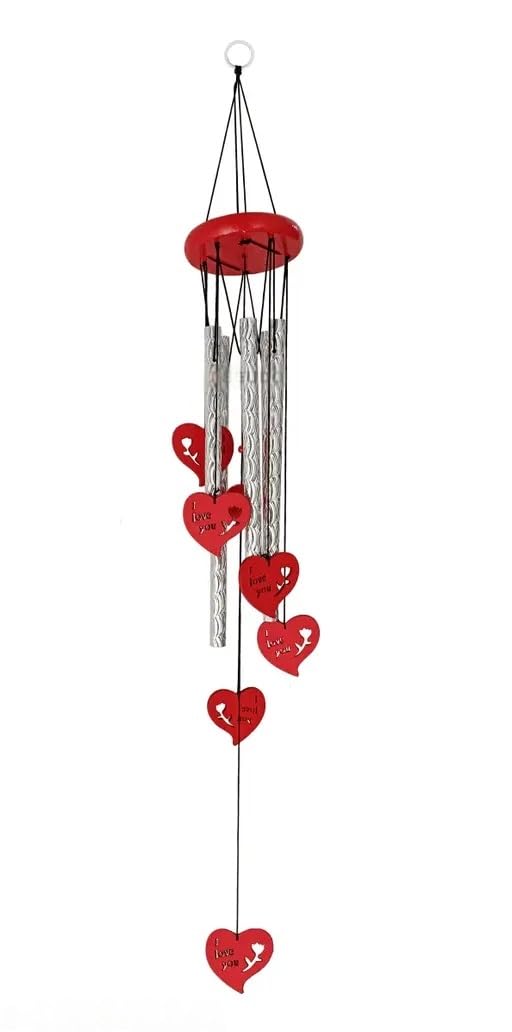 Wind Chimes with Red Hearts, Metal Tubes, Hanging Outdoor Decor, Love Theme