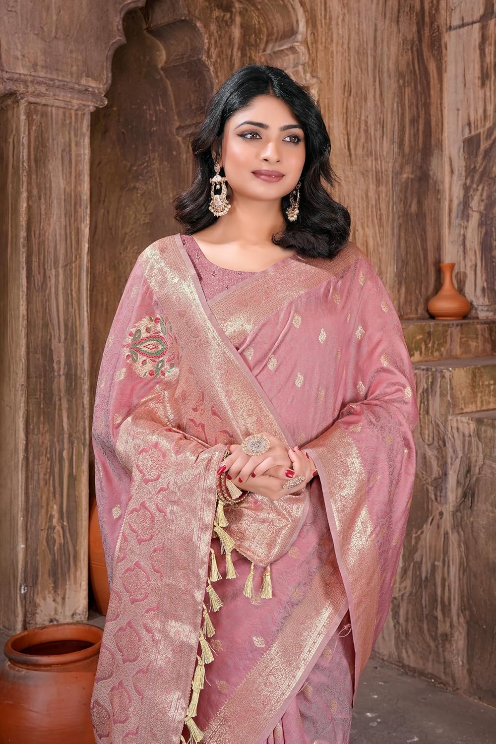 Women’s Banarasi Silk Blend Woven Zari Saree with Unstitched Blouse Piece (Available in Pista Green, Dusty Pink, Lavender, Sky Blue)