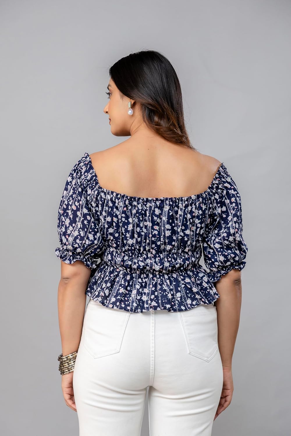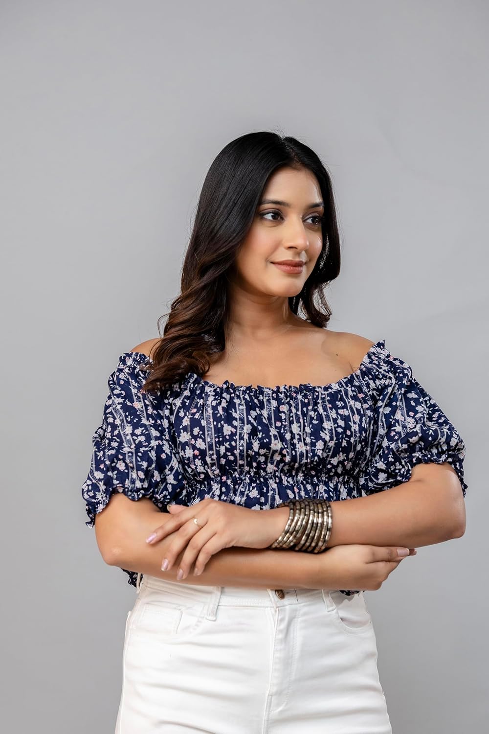 Color and Print: It has a rich maroon color with a vibrant, all-over floral print in smaller red, white, and possibly green accents. Neckline: The top features a wide square neckline which can often be worn off the shoulder. Sleeves: It has short, voluminous puff sleeves with elasticated cuffs. Fit and Details: The bodice is fully smocked, providing a comfortable, body-hugging, and flexible fit that accentuates the waist. It ends in a cropped length, often with a subtle ruffled or peplum-style hem.