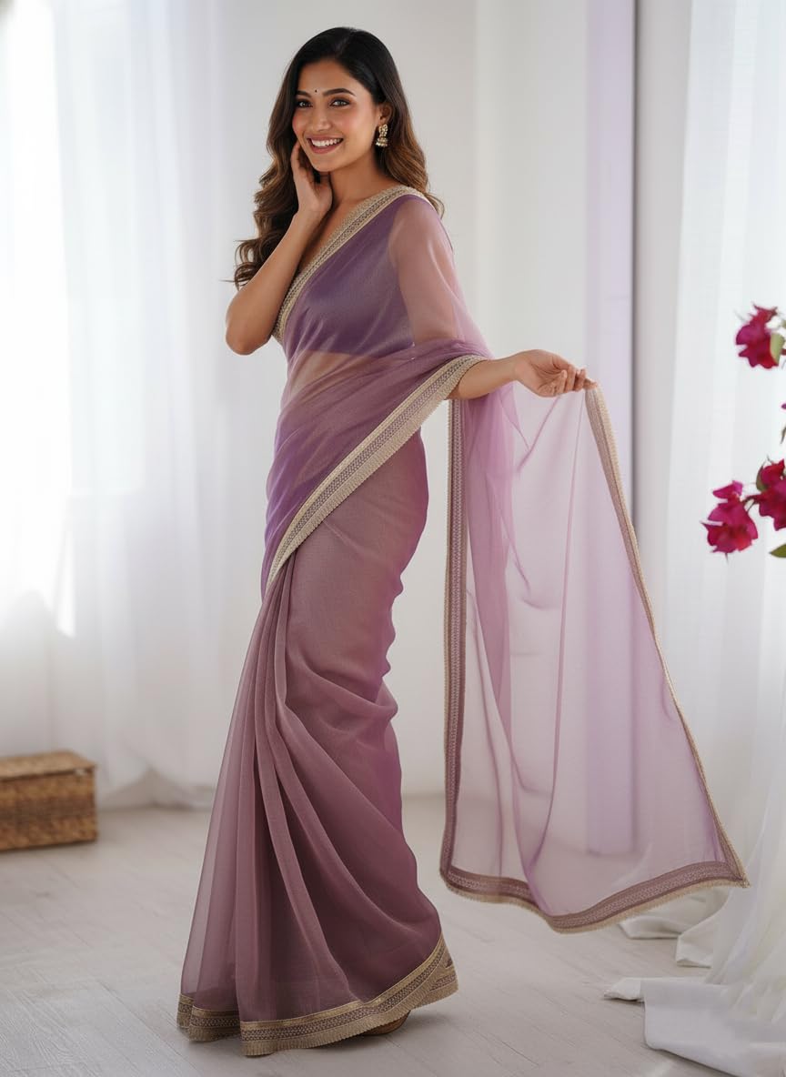 Women’s Organza Plain Lace Border Saree | Purple Color Saree | Women Sari | Saree_(AZ-JN-OG3-DILBAR PURPLE)