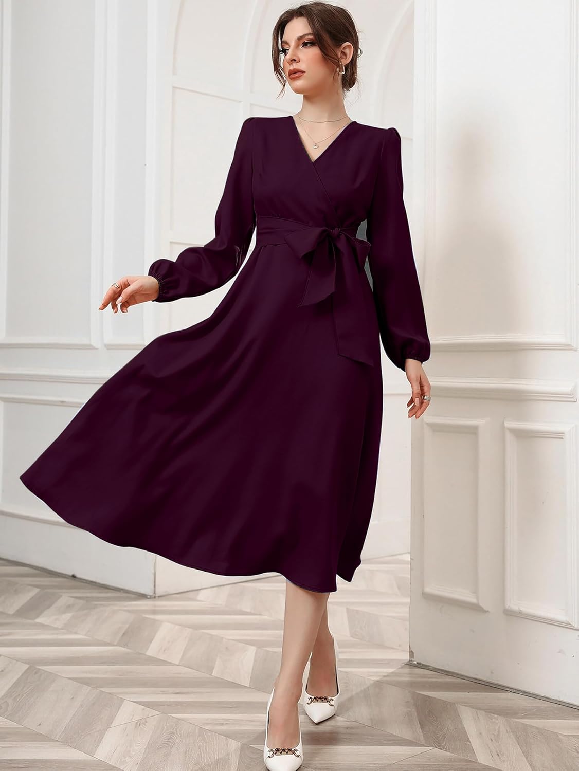 Women’s Polyester A-line V-Neck Bishop Sleeve Midi Belted Dress
