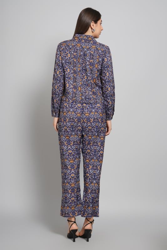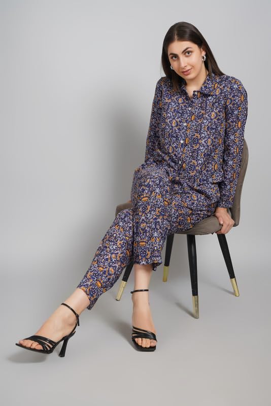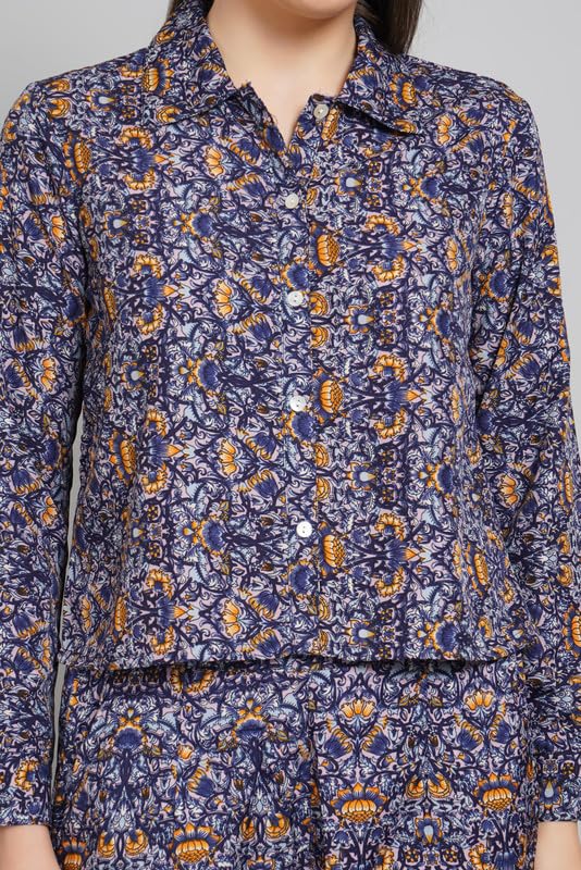 • Women’s Printed Co-ord Set | Poly Crepe Two-Piece Outfit with Cropped Shirt & High-Waist Pants | Lightweight Boho Style for Casual