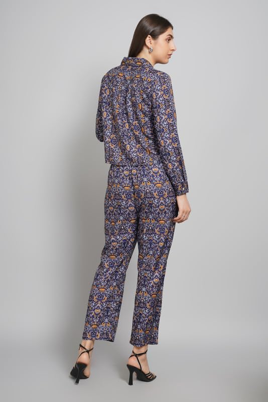 Women’s Printed Co-ord Set | Poly Crepe Two-Piece Outfit with Cropped Shirt & High-Waist Pants | Lightweight Boho Style for Casual