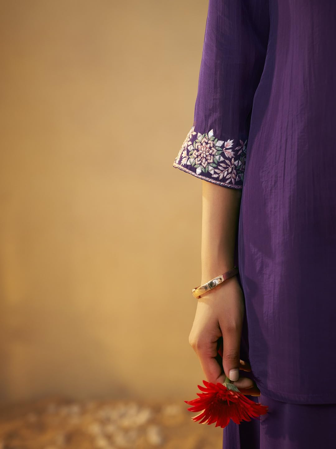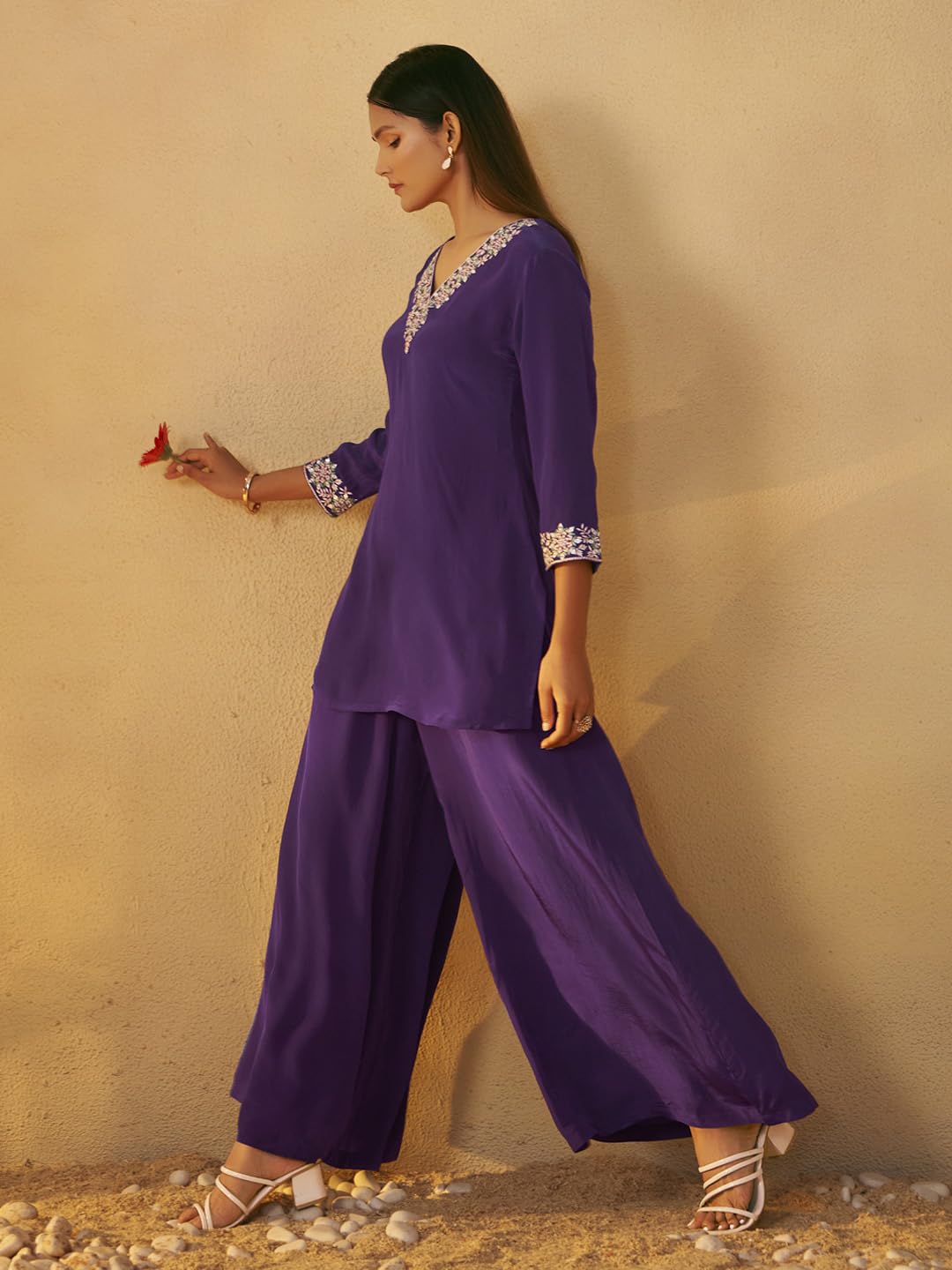 Add a Touch of Elegance to Your Festive Wardrobe with This Chic Purple Kurta Palazzo Set. the Kurta Features a Flattering V-Neckline Enhanced with Delicate White Floral Embroidery, Adding an Element of Sophistication to the Minimal Silhouette. Matching Embroidered Sleeve Cuffs Elevate the Look, While the High-Waisted Flared Palazzo Pants Ensure Both Comfort and Elegance. Crafted from a Breathable, Soft-Touch Fabric, This Outfit Is Perfect for Festive Days, Ethnic Gatherings, and Special Occasions. Pair It with Statement Earrings and Heels for a Stunning Ethnic Ensemble.