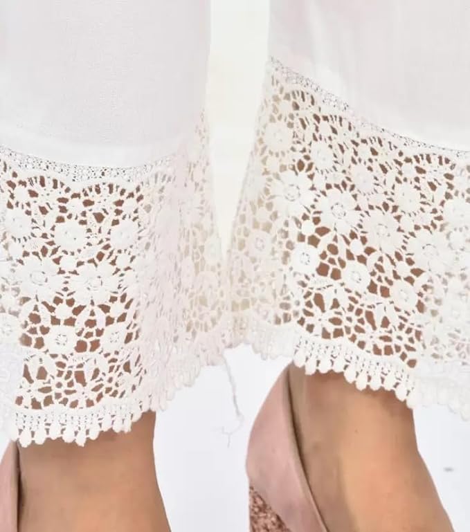 Stand out effortlessly with the exquisite detailing adorning the bottom of these palazzos. The intricate design adds a touch of sophistication and elevates the overall aesthetic appeal, making it perfect for both casual and semi-formal occasions.Versatile Styling: Pair this non-transparent white palazzo effortlessly with a variety of tops, kurtas, or tunics. Its neutral tone complements various colors and prints, making it a versatile addition to your ethnic wardrobe.