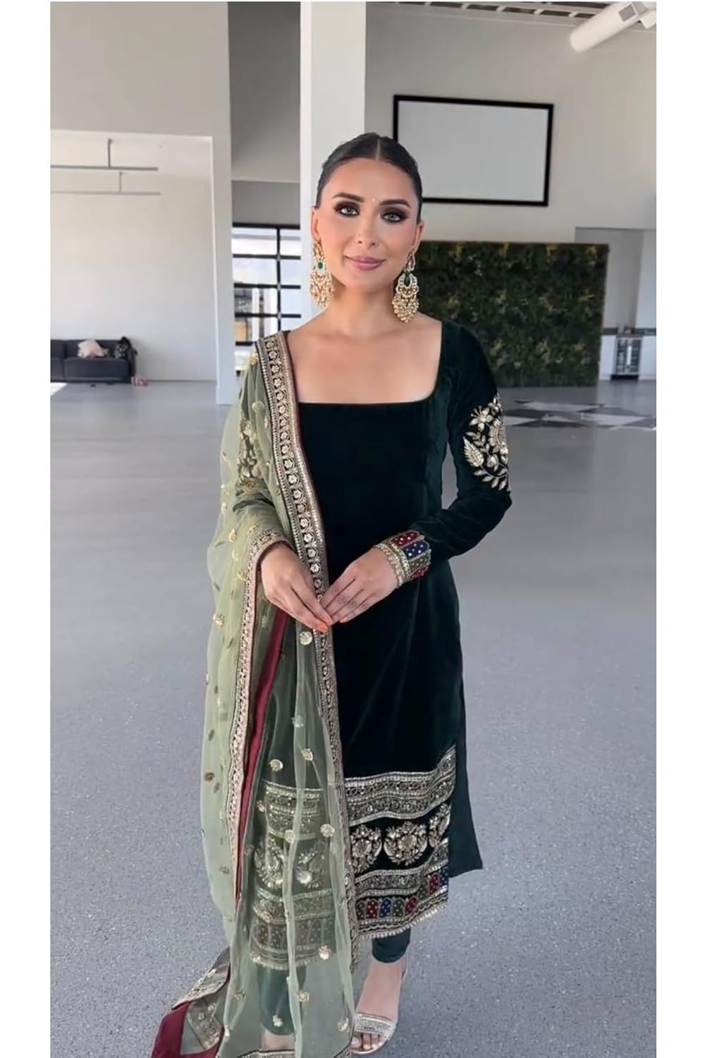WOMEN’S Velvet Elegant Stitched Salwar Suit – Long Kurti with Embellished Sleeves, Wedding & Festival Collection (SF201517 Black free-size)