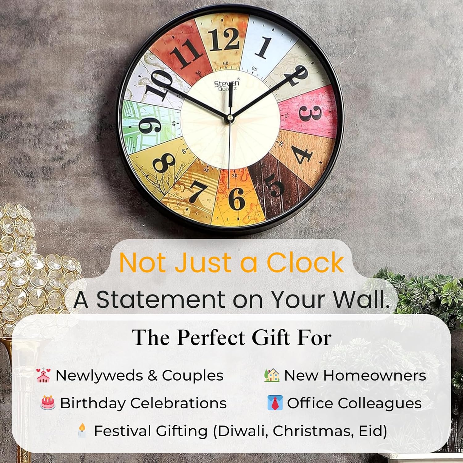Unique Design: This analog wall clock features a multi-coloured round dial with an abstract pattern, adding a touch of vibrancy and style to any room.