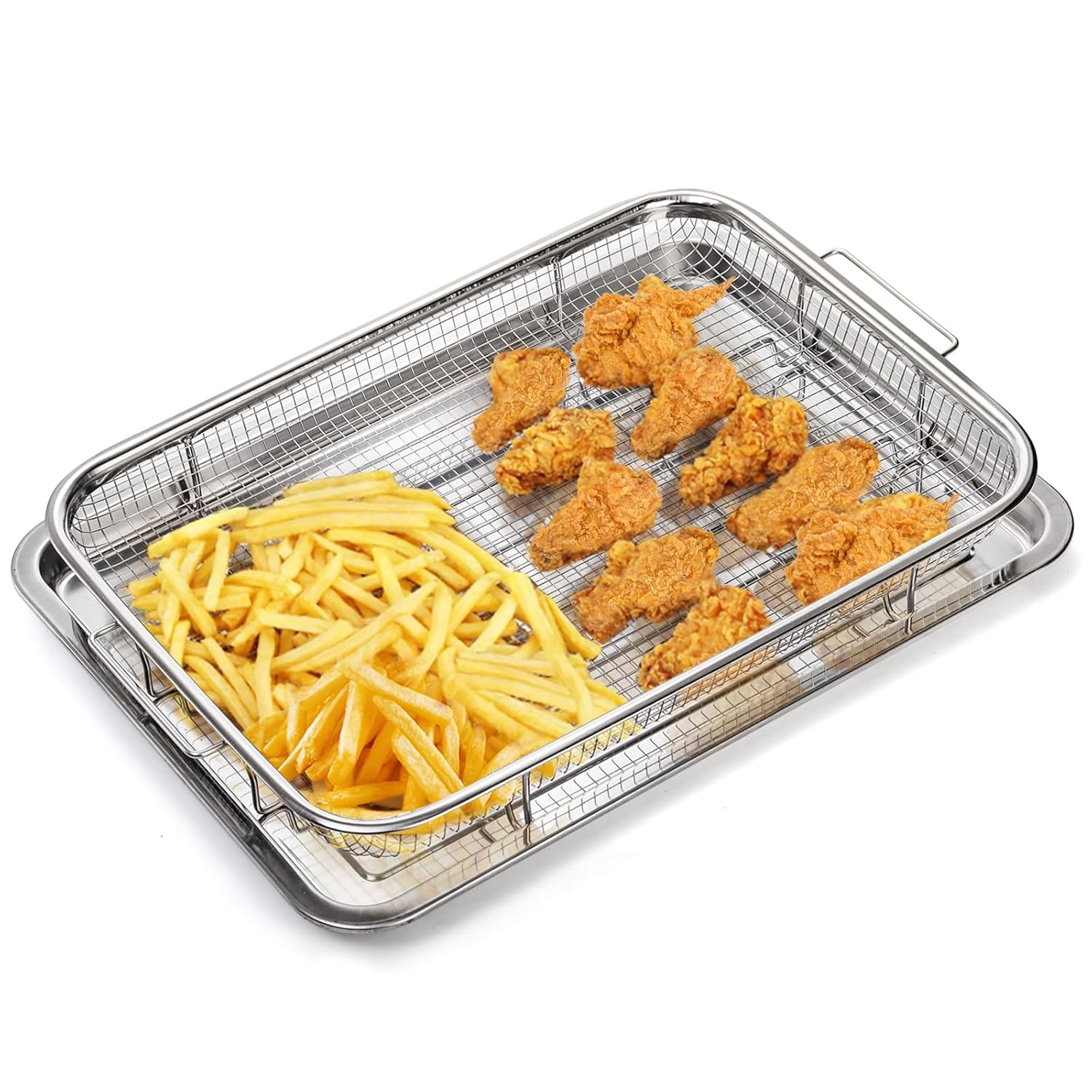 Yarlung 2 pack air fryer basket and tray set for oven, the mesh basket 14.25″L x 10.3″W x 2.1″H, crisper tray 15″L x 11″W x 0.8″H. High quality 304 stainless steel, food-grade material, non-stick, sturdy and durable, easy to clean.