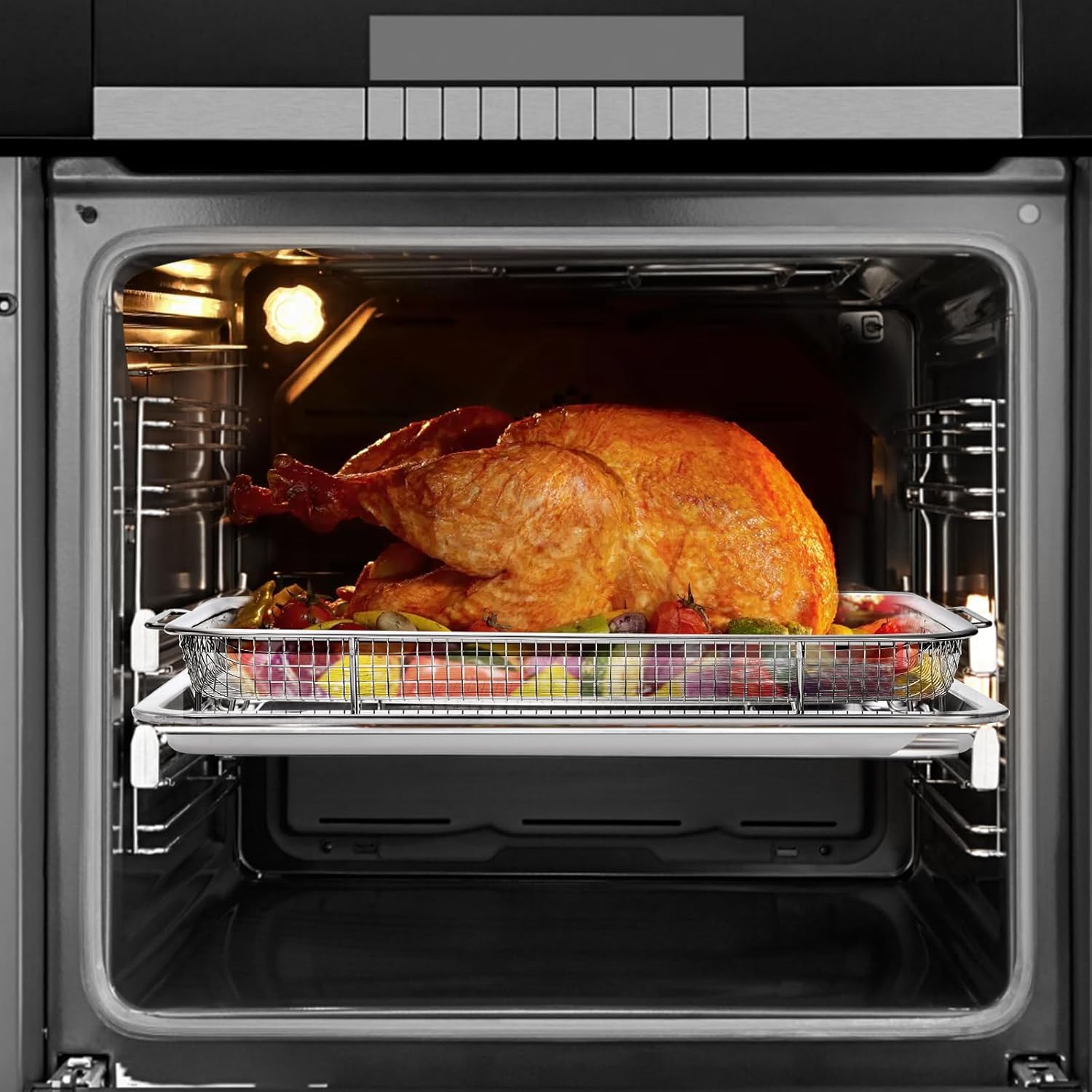 Convenient Cooking: Our oven air fryer basket ensures all-around crispness of the food being cooked, you won’t need flipping or turning your food, cooking crispy result without burning. Nest the baking tray underneath to catch crumbs and drips.