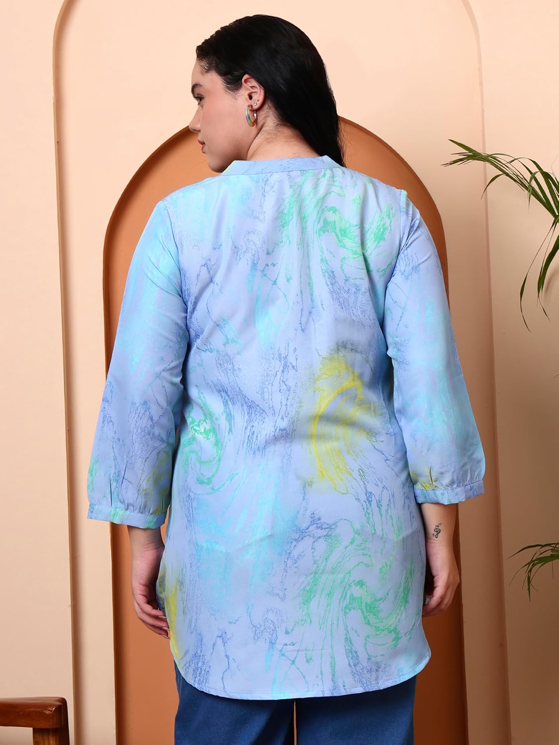 Refresh your ethnic wardrobe with this stunning Women’s Polyester Marble Print Kurti from Yash Gallery. Crafted in soft and breathable polyester, this kurti is designed with delicate pintuck pleats on the front panel, accentuated with matching fabric-covered buttons that enhance its elegant charm. The soothing pastel blue base with abstract marble patterns in yellow and green creates a trendy and graceful appeal. The kurti comes with a stylish mandarin collar neckline, 3/4th sleeves, and a flared hem that provides ease of movement and a flattering fit. Whether you’re dressing up for a day at the office, a casual outing, or festive gatherings, this piece offers the perfect blend of comfort and style. Pair it effortlessly with leggings, jeggings, or palazzo pants to complete your look. Choose Yash Gallery for authentic ethnic fashion with a modern twist – where comfort meets elegance.