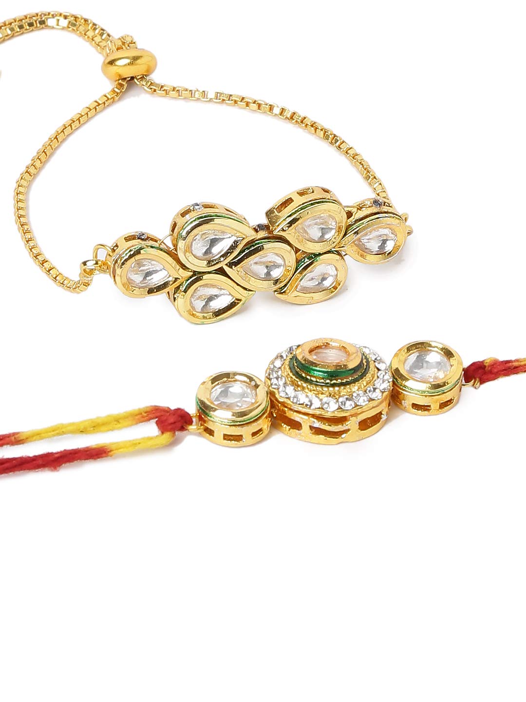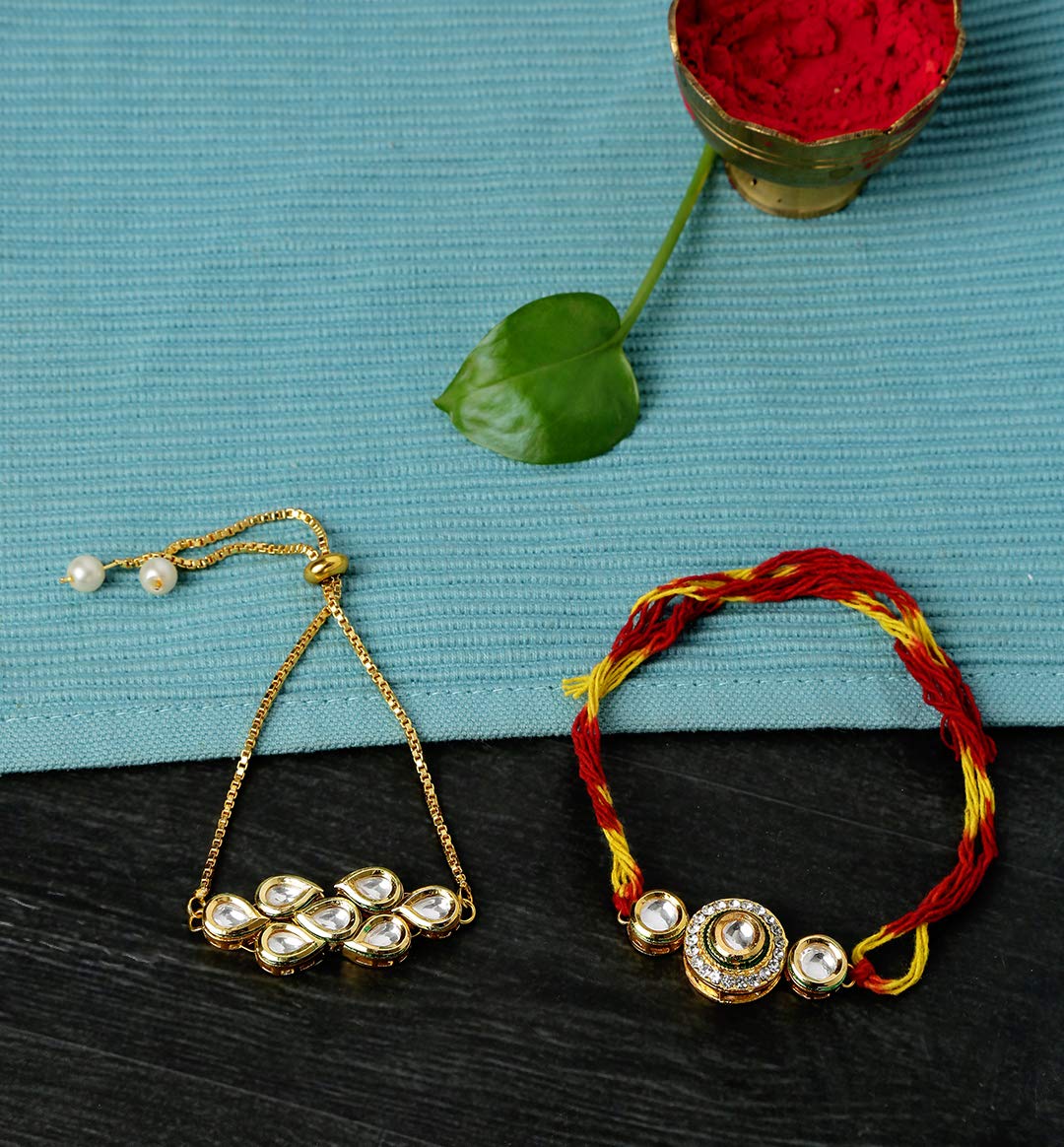 Yellow Chimes Rakhi for Brother and Bhabhi Gold Plated Kundan Bhaiya Bhabhi Rakhi Set Handmade Dori Worked Rakhi Combo of 2 PCs Men Rakhi Bracelet With Roli & Chawal