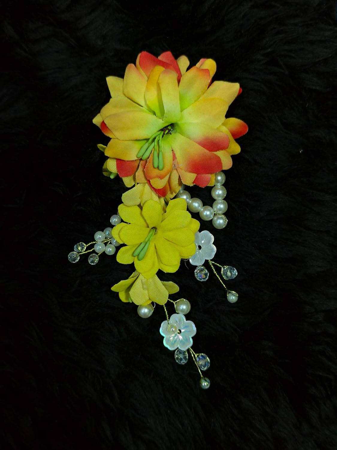 Add a touch of elegance to your hairstyle with this stunning floral hair accessory. The beautifully crafted piece features vibrant yellow blossoms with delicate orange-tipped petals, creating a striking sunset-like effect. The arrangement is adorned with lustrous pearl-like beads and sparkling crystal drops that catch and reflect light magnificently. Complementing green foliage and small white flowers add depth and dimension to the design. This versatile hair ornament is perfect for special occasions, festivals, or traditional celebrations. The secure attachment ensures the piece stays firmly in place throughout your event. The artful combination of colours and textures makes this accessory a standout choice for enhancing any formal or traditional ensemble. Each detail has been carefully assembled to create a harmonious blend of traditional and contemporary design elements.