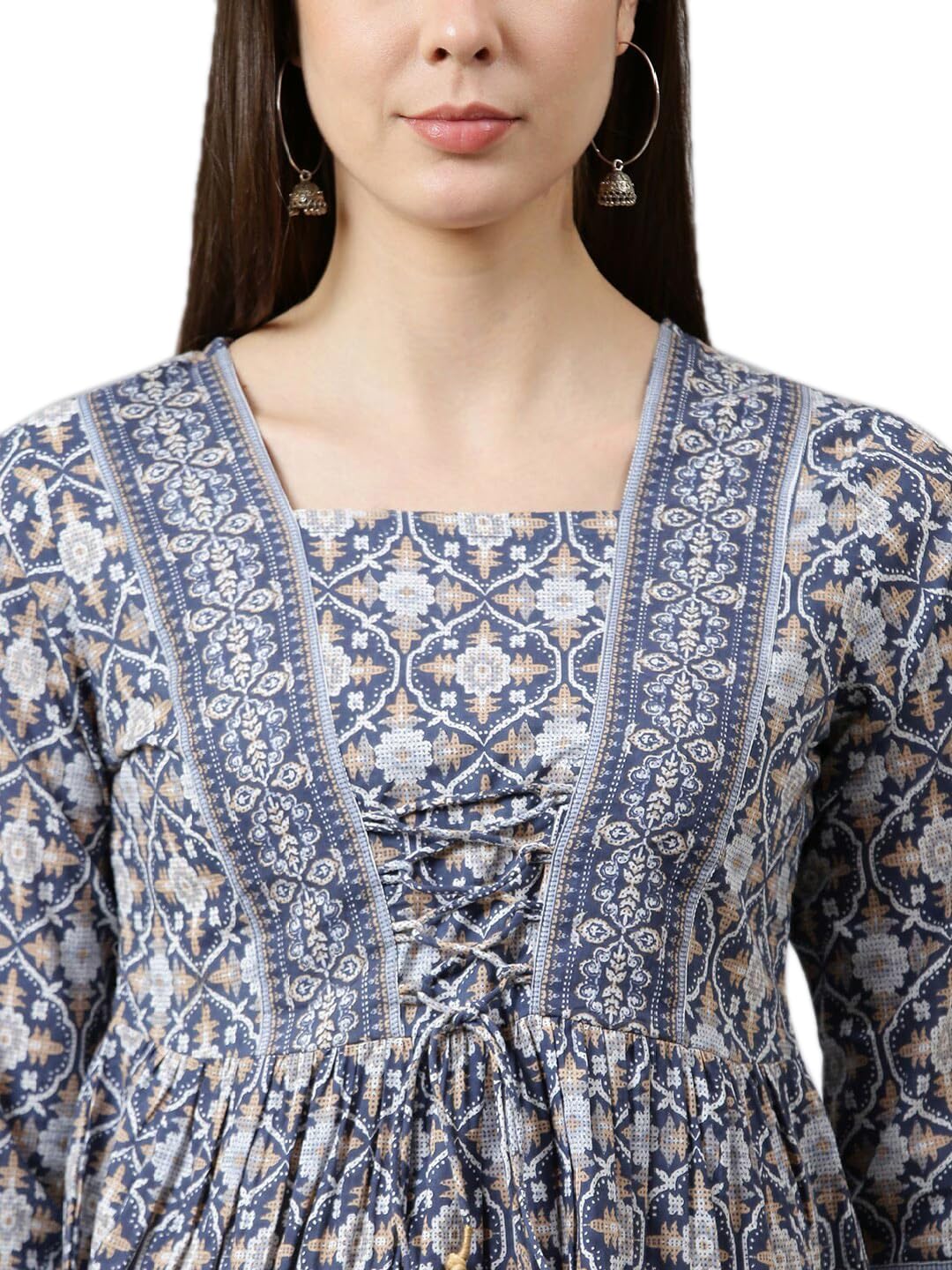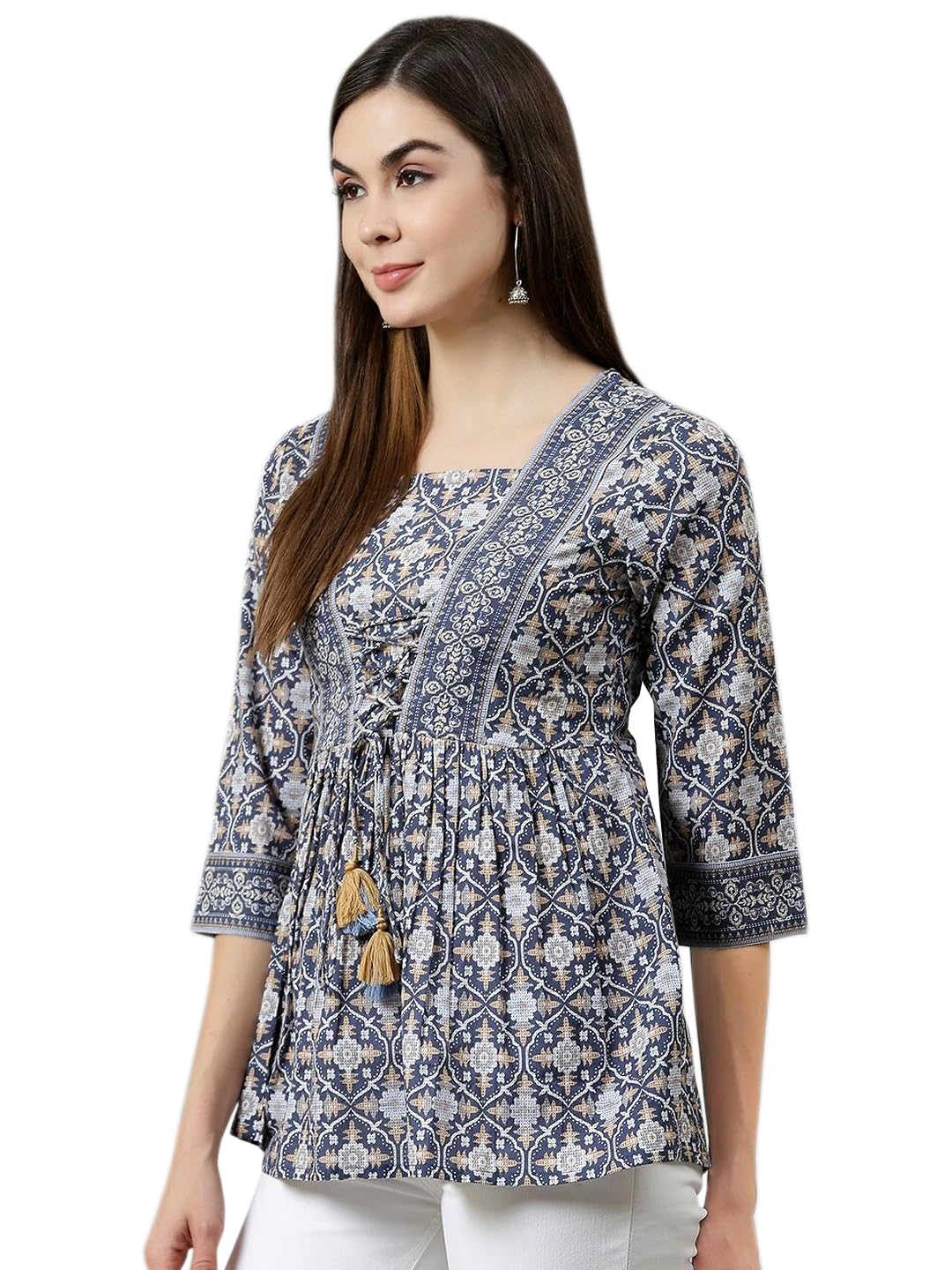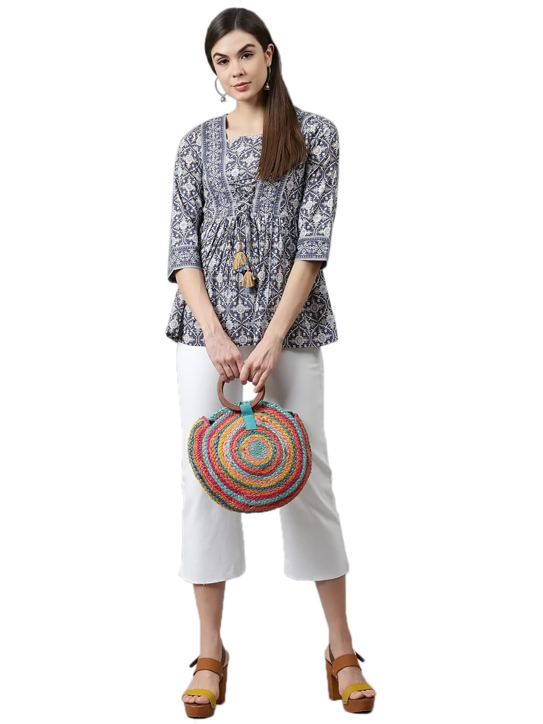 This top is adorned with navy blue color and geometric print. The dori loops design adds a classy touch.