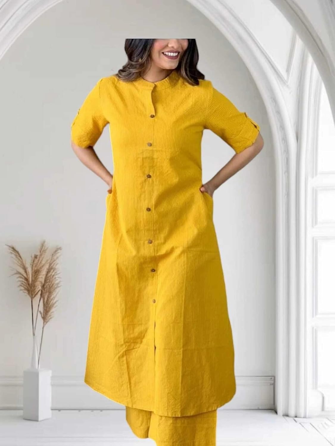 Elevate your everyday wardrobe with the ZANETA Women’s Katha Cotton Fabric 3/4 Sleeves Mandarin Collar Solid Cord Set. Crafted from premium Katha cotton, this stylish co-ord set seamlessly blends comfort and elegance. The mandarin collar and 3/4 sleeves give the outfit a refined look, while the relaxed fit ensures all-day ease. Perfect for casual outings, work-from-home wear, or relaxed evenings, this cord set is an essential addition to your fashion collection. Pair it with minimal accessories for a sophisticated yet laid-back style.
