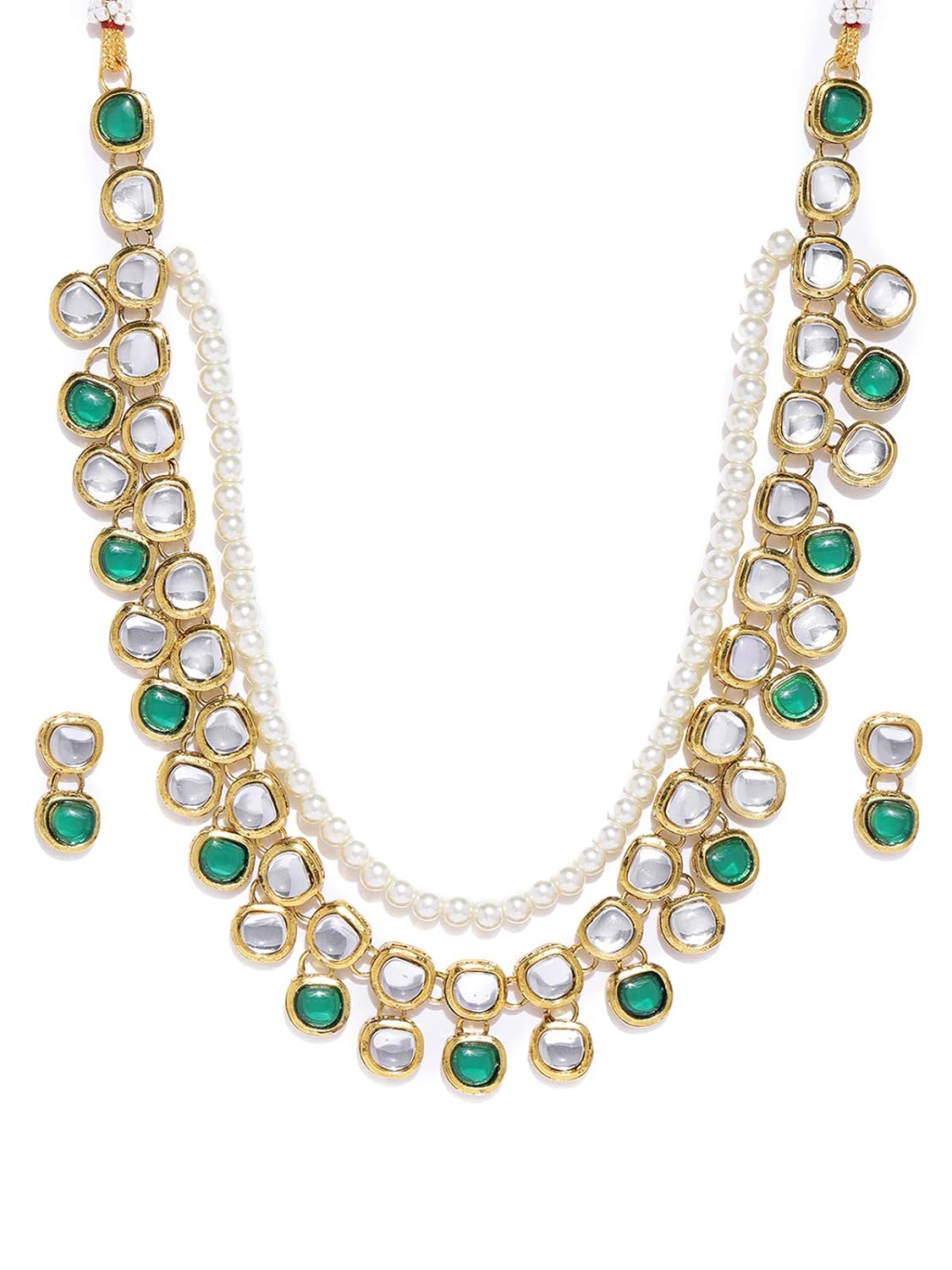 ZAVERI PEARLS Combo of 2 Pink & Green Stones Embellished Ethnic Kundan Necklaces & Earrings Set For Women-ZPFK21412