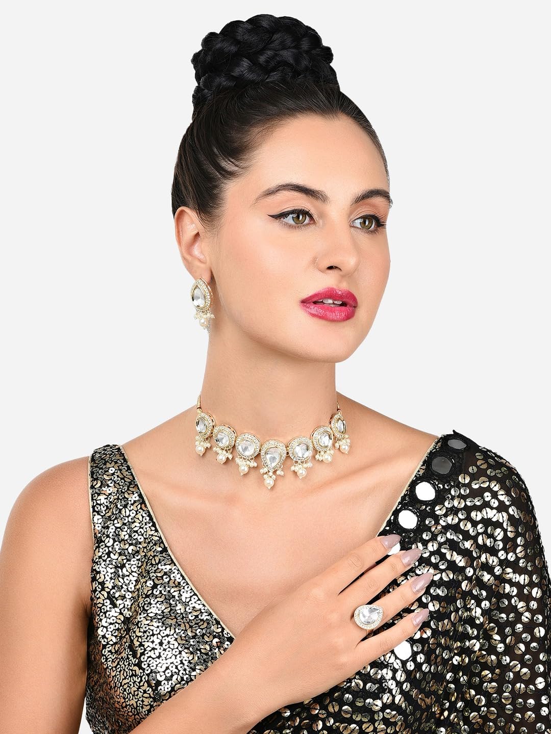 ZAVERI PEARLS Gold Tone Austrian Diamonds Kundan Choker Necklace Earring Ring Set For Women-ZPFK18484