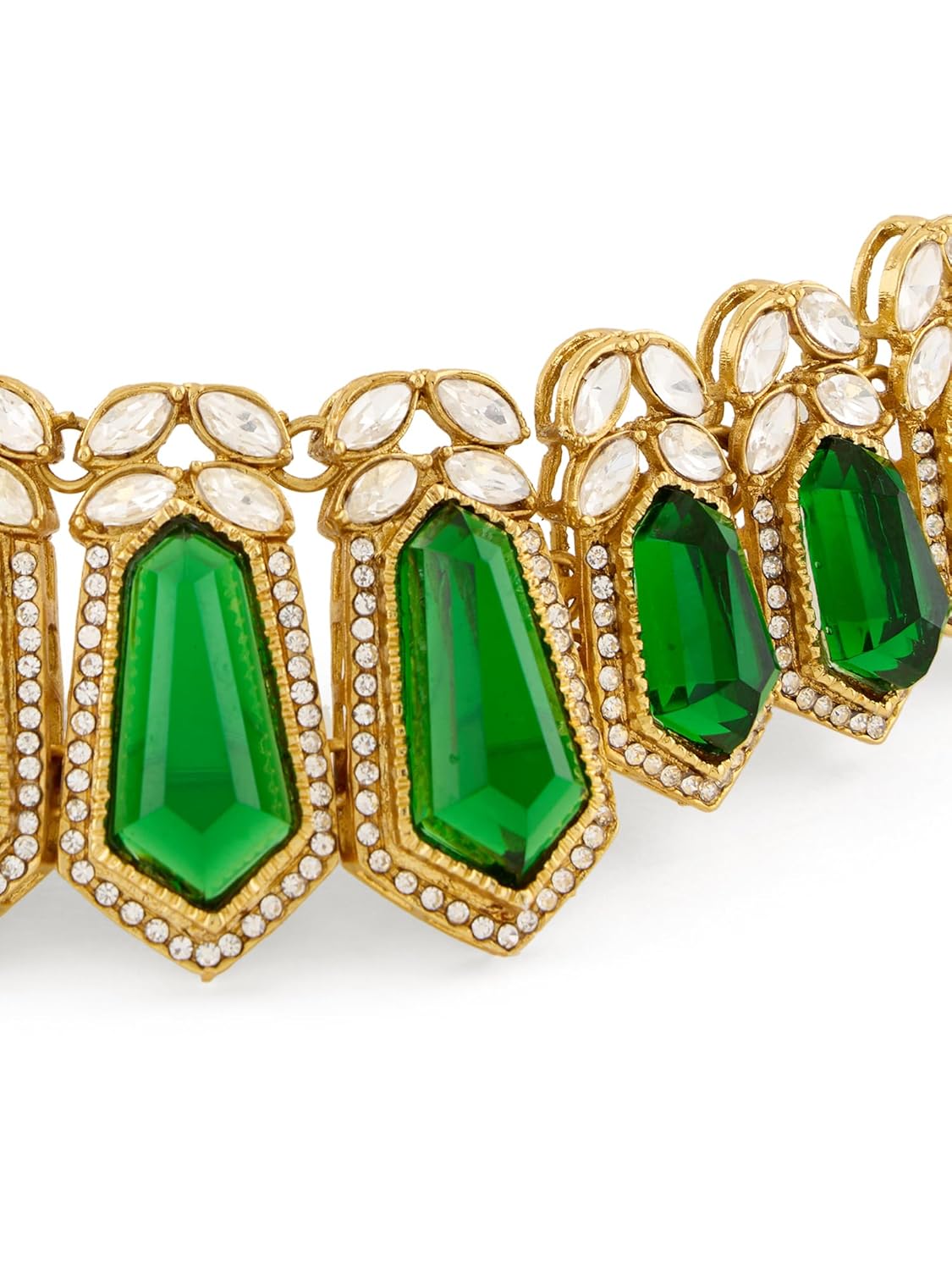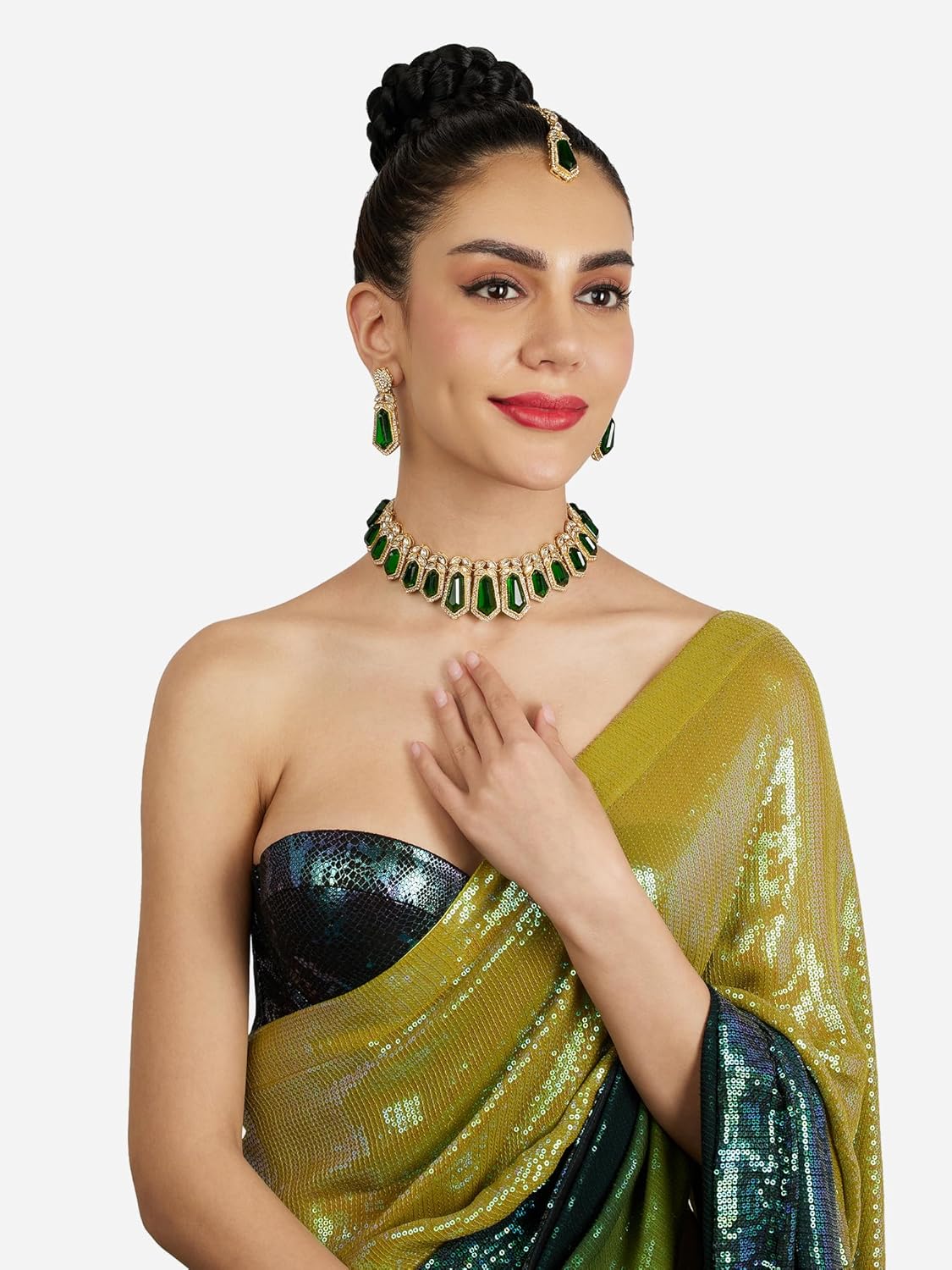 ZAVERI PEARLS Green Dazzling Statement Stones Austrian Diamonds Choker Necklace Earring & Maangtikka Set For Women-ZPFK21787