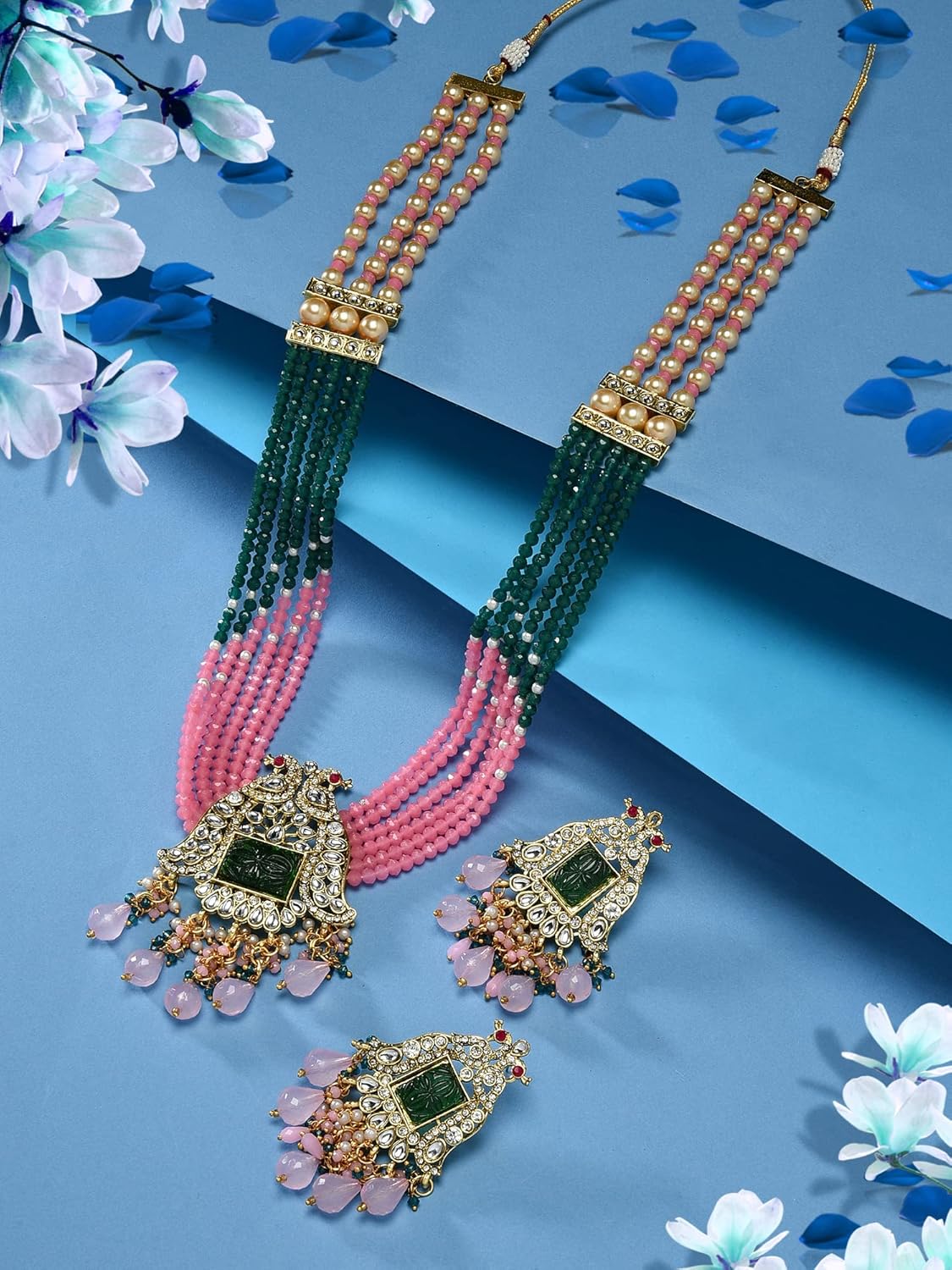 ZAVERI PEARLS Green Pink Multistrand Beaded Peacock Inspired Kundan Necklace Earring Set For Women-ZPFK21754
