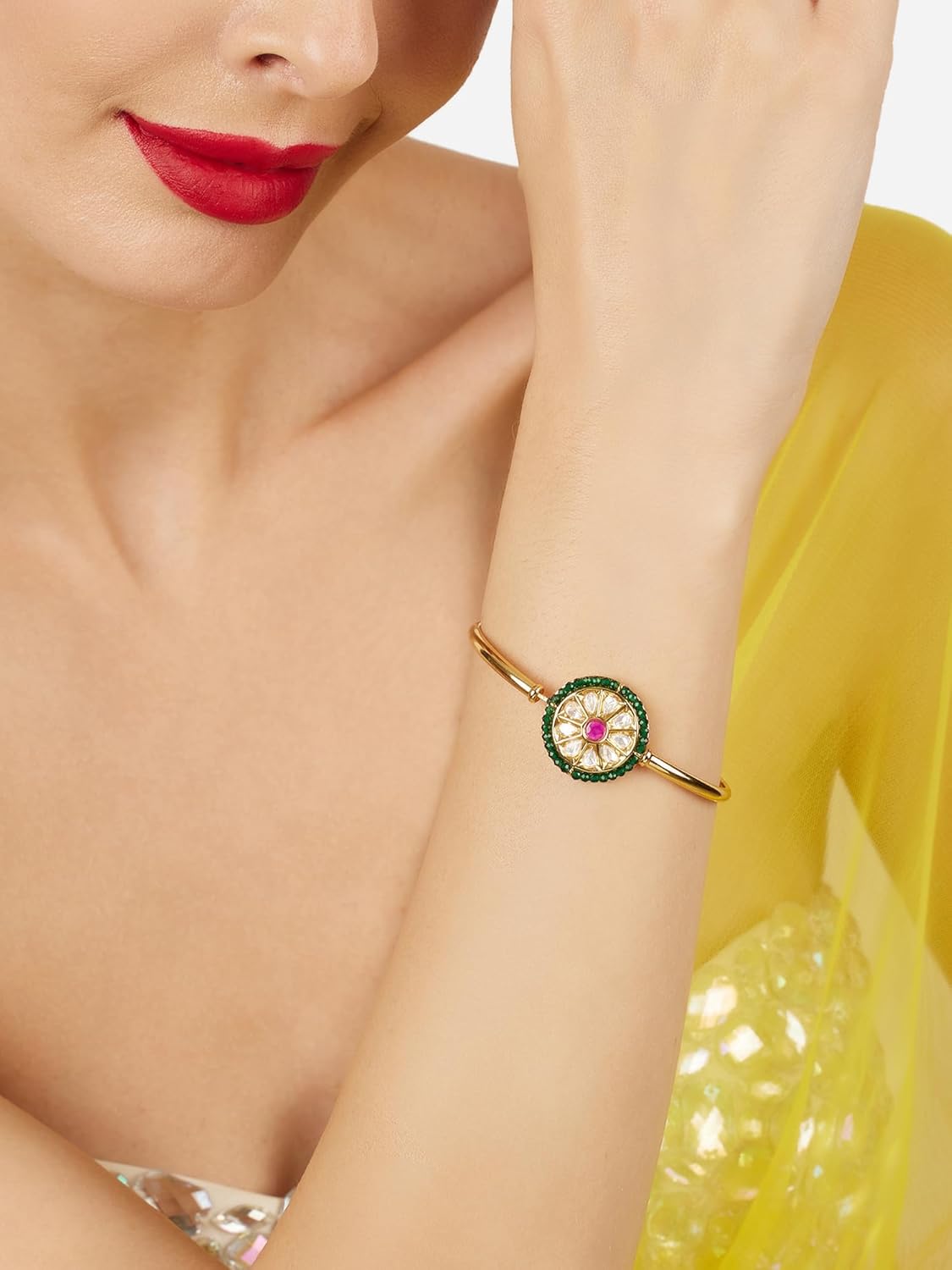 Bracelets Are An Easy Way Of Amping Up Your Outfit. This Contemporary Bracelet Design Is Very Fashionable, Subtle And Trending Which Is Embellished With Dazzling Cubic Zirconia. Most Often To Be Worn At Parties Or Festives, This Bracelet Can Be Paired With Western or Indo Western outfits In Rich Colours.