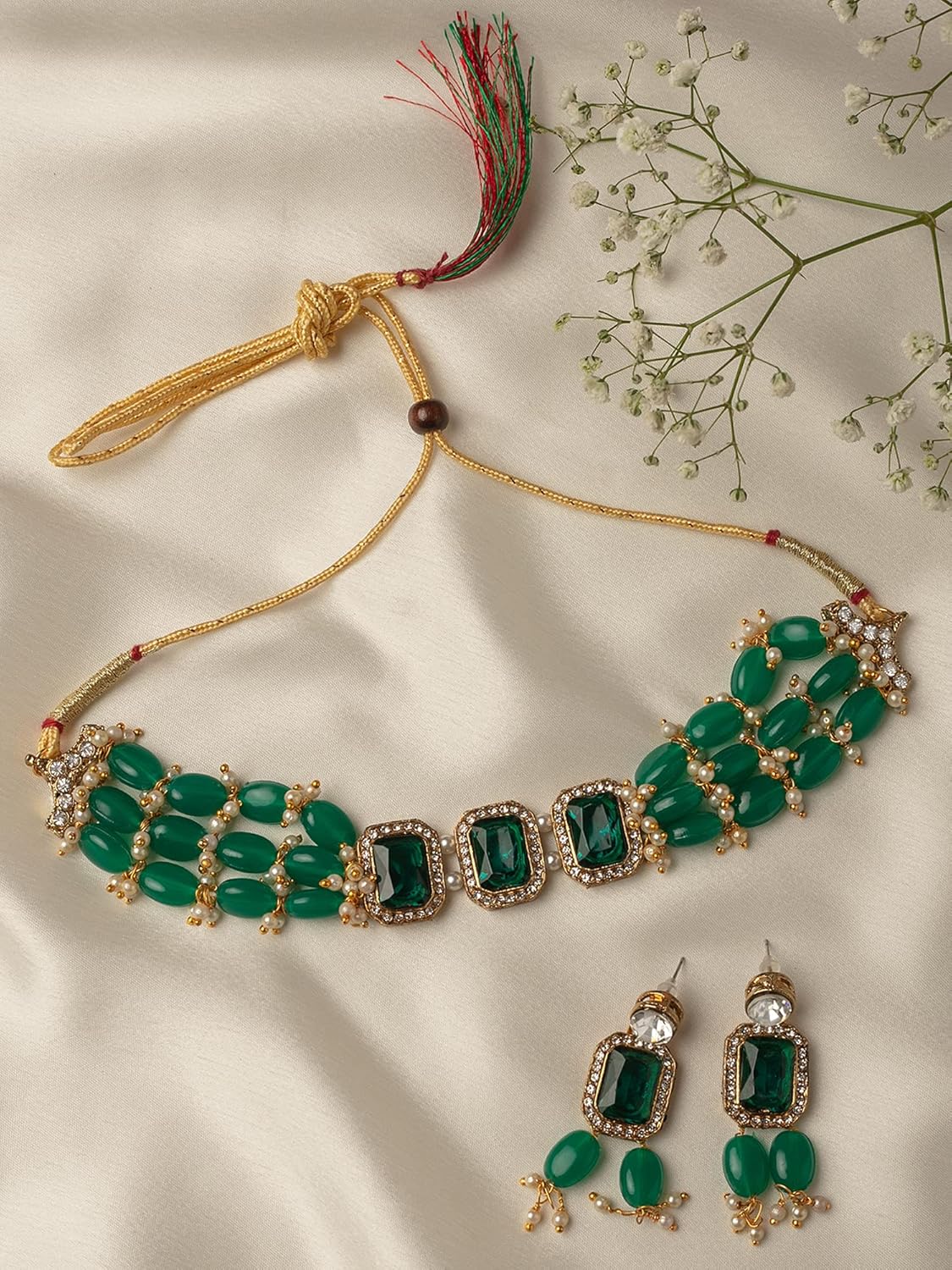 Flaunt Your Distinct Style Statement By Wearing This Necklace & Earring Set From The House Of Zaveri Pearls. We Also Have An Absolute Range Of Jewellery Set Such As Long Necklace, Layered Necklace, Multistrand Necklace, Choker, Bib Necklace, Collar Necklace, Princess Necklace, Moti Mala Set. Zaveri Pearls Brings An Exclusive Assortment Of Fashion Jewellery & Accessories Like Kundan Jewellery, Pearls Jewellery, Meenakari Or Enamel Jewellery, Temple Jewellery, Goddess Laxmi Jewellery, Lord Ganesh Jewellery, Radha Krishna Jewellery, Silver Or Oxidised Jewellery Used For Navratri, Peacock Inspired Jewellery, Floral Jewellery, Chunky Jewellery, Quirky Jewellery, Brass Jewellery, Vacation Jewellery, Casual Jewellery, Bridal Jewellery, Bridemaids Jewellery, Padmavati Inspired Jewellery, Multi-Color Jewellery, Minimal Jewellery, Traditional Or Ethnic Jewellery, Statement Jewellery, Contemporary Jewellery, Trendy, Stylish & Fancy Jewellery, Work Wear Jewellery, Western Jewellery, Animal Accents Jewellery, Combo Jewellery, Beaded Jewellery, Antique Jewellery, Rose Gold Jewellery. This Jewellery Can Be Used For Multiple Events, Occasions & Ceremonies Like Festivals, mehandi, Haldi, Sangeet, Engagement, Wedding, Destination Wedding, Reception, Baby Shower, Party Or Fashion Shows. It Can Also Be Best Pick For Trousseau Or Gifting.