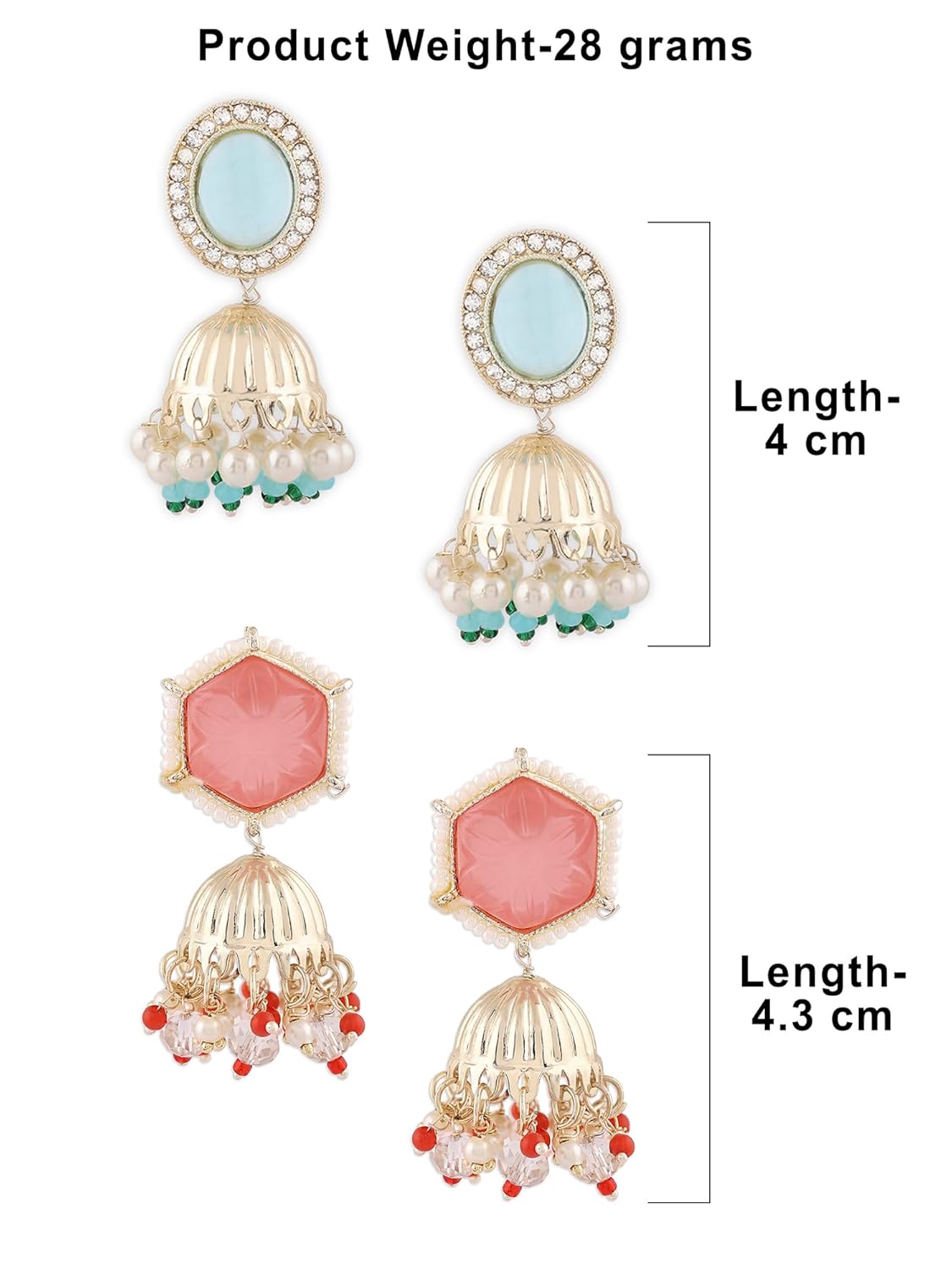 Zaveri Pearls Set Of 2 Turquoise Blue & Peach Austrian Diamonds Stones & Beads Traditional Jhumki Earring For Women-ZPFK16848