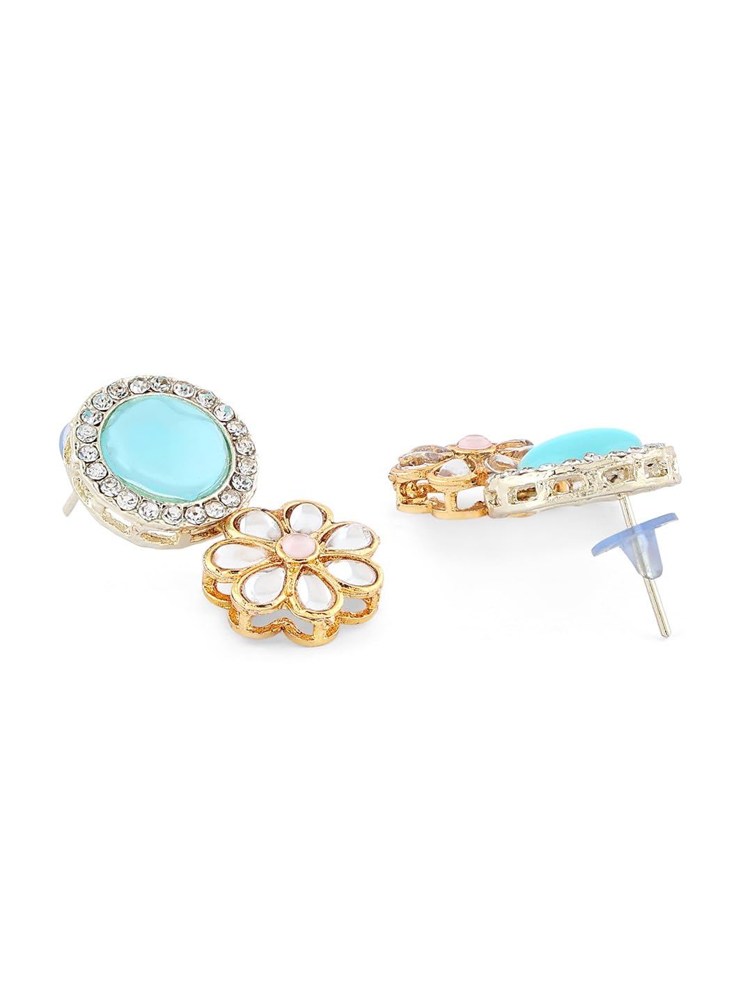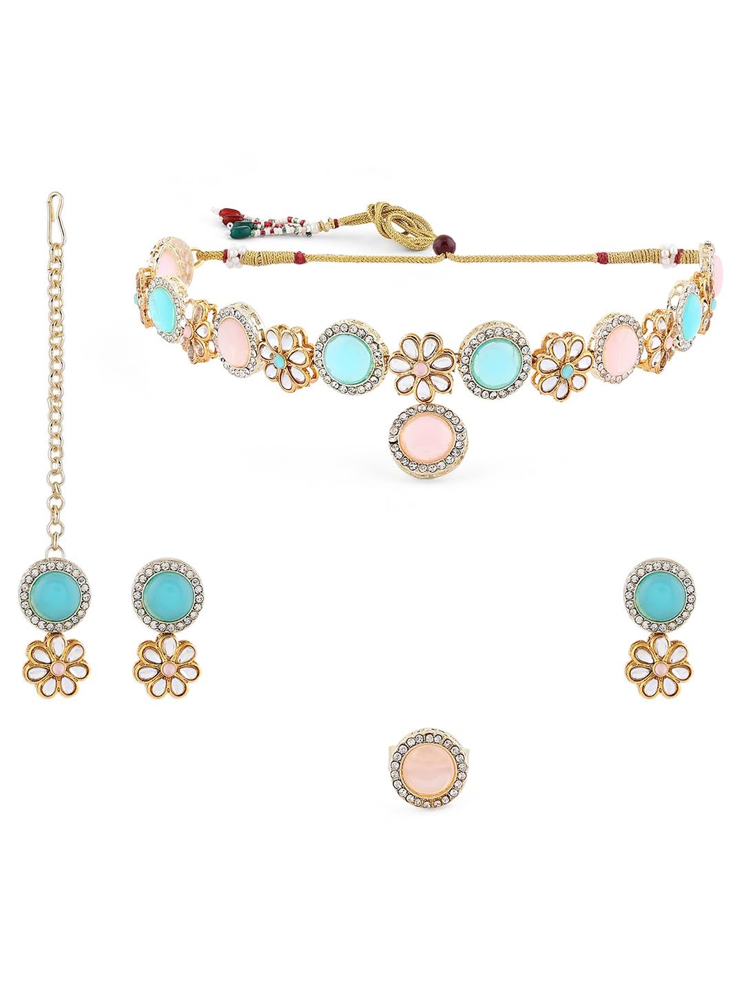 ZAVERI PEARLS Turquoise Blue Pink Kundan Flowers Necklace Earring Maangtikka Ring Set For Women-ZPFK18534
