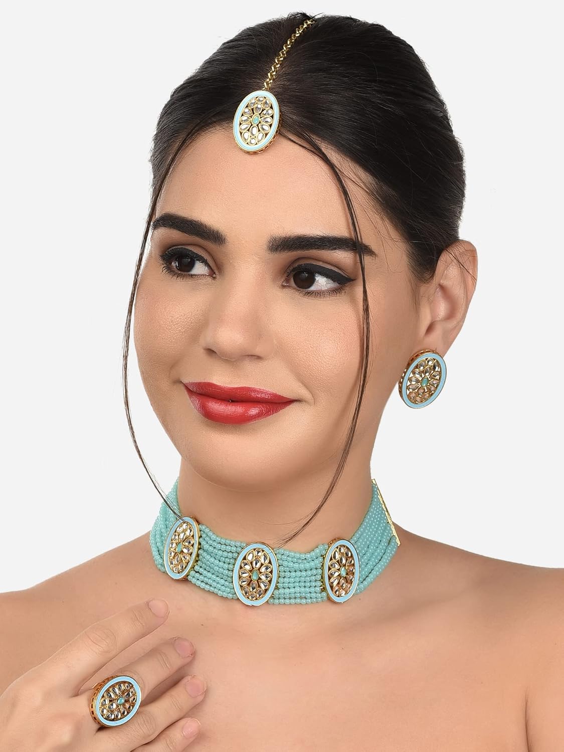 ZAVERI PEARLS Turquoise Multistrand Kundan Choker Necklace Earring Maangtikka & Ring Set For Women-ZPFK12631