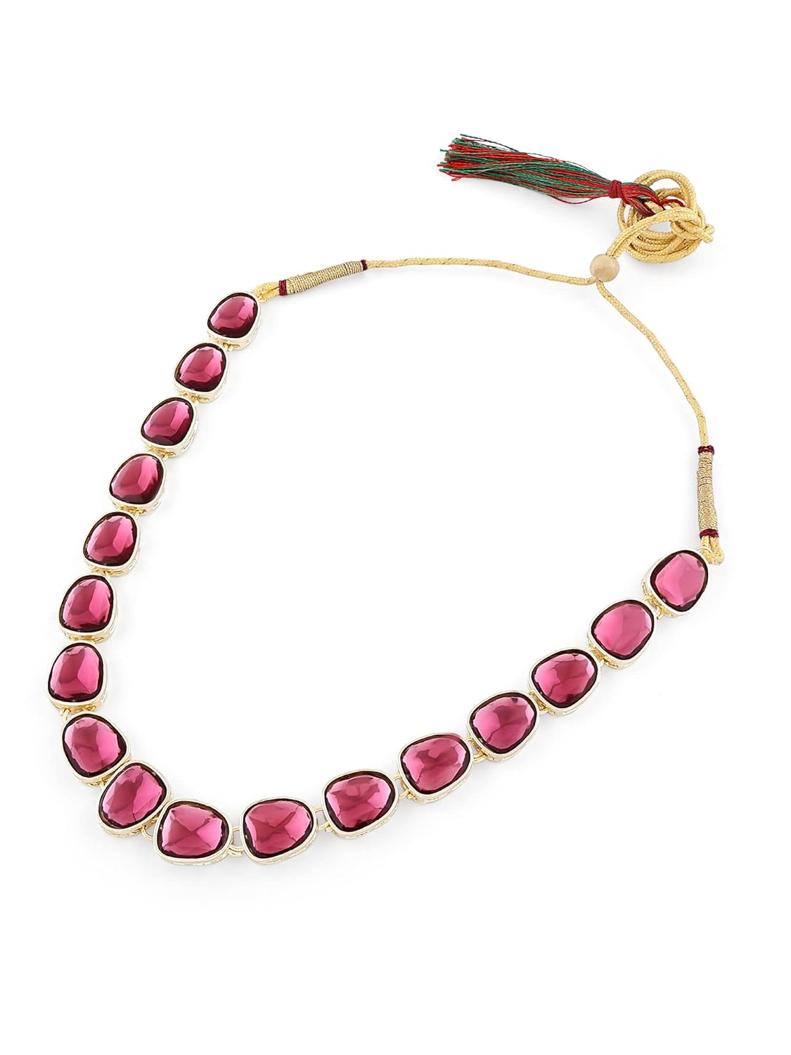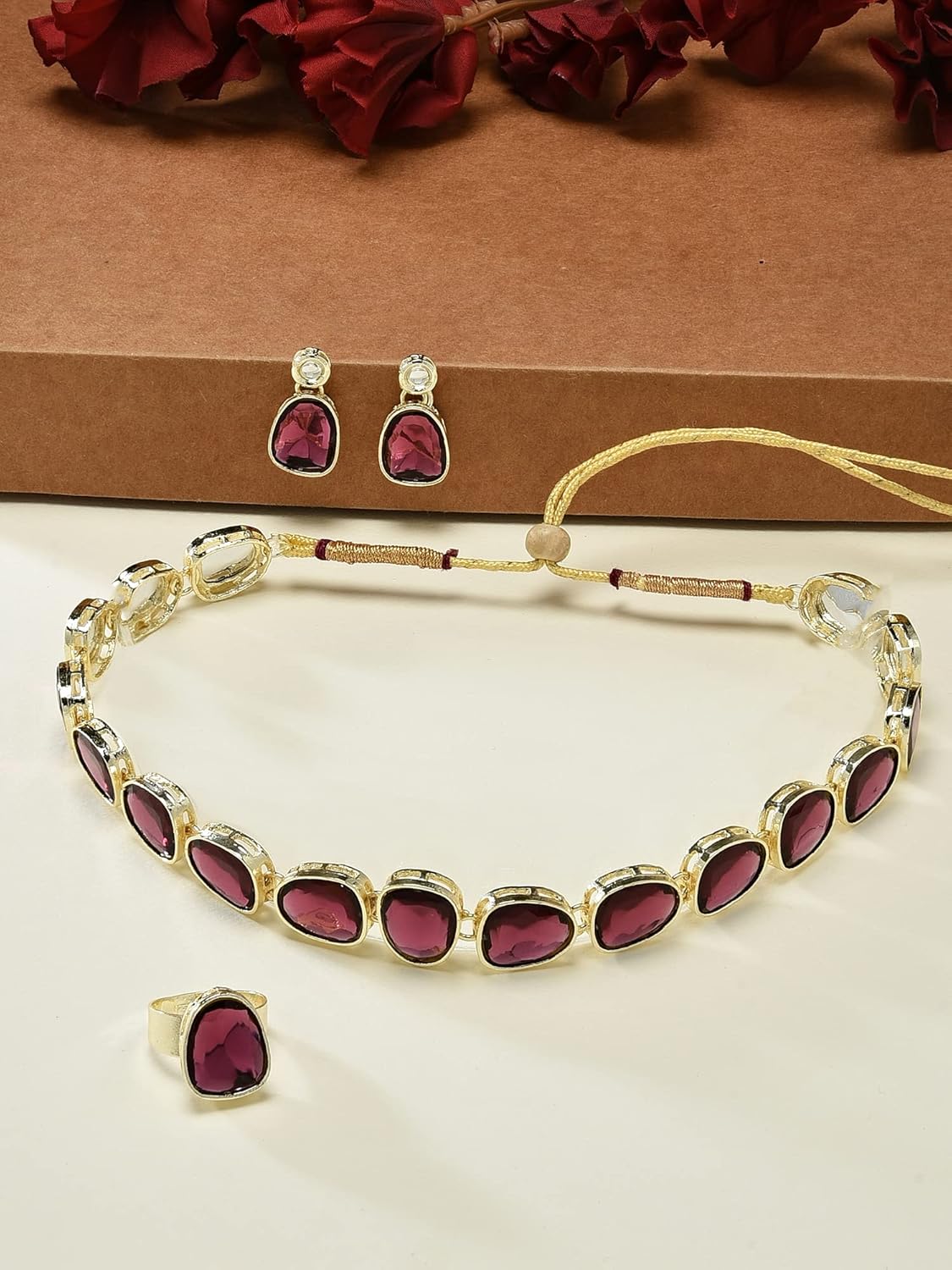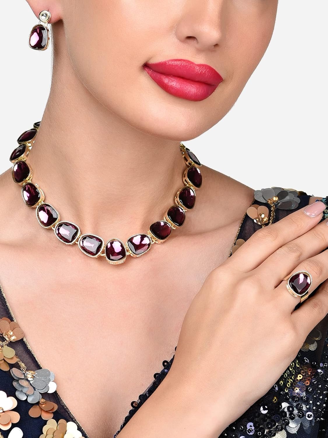 ZAVERI PEARLS Wine Color Stones Embellished Fusion Necklace Earring & Ring Set For Women-ZPFK15893