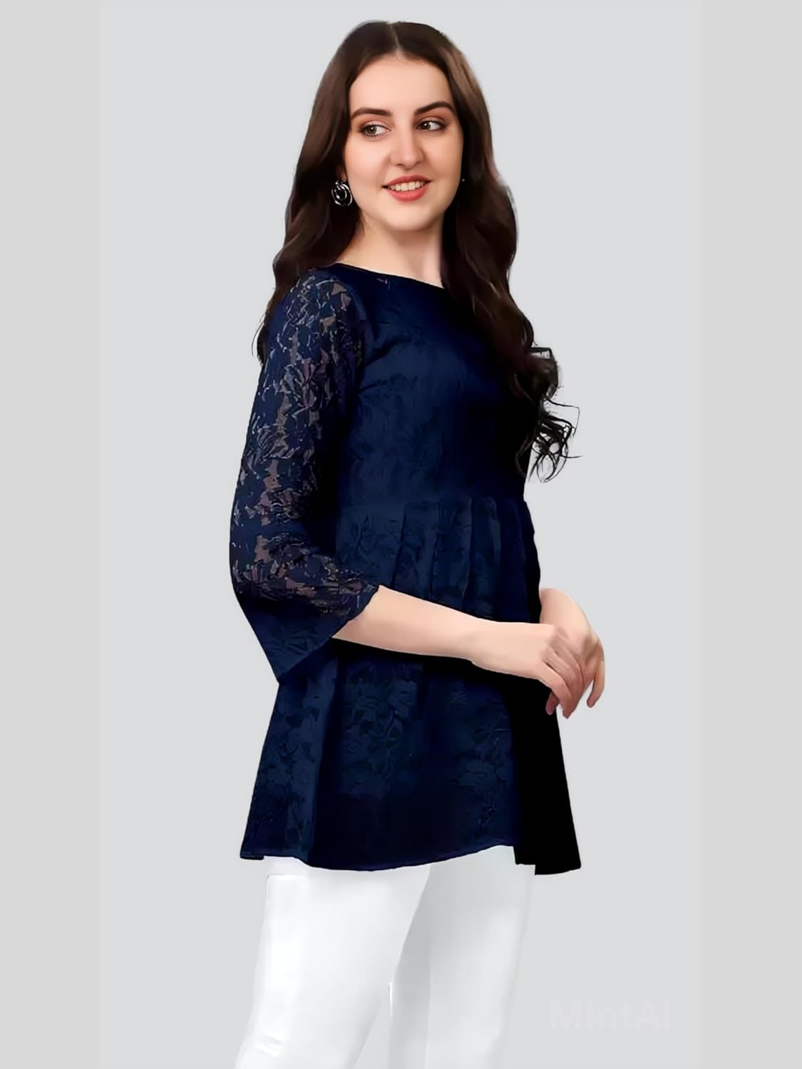 ZELZIS Women Russel Net with Crepe Inner Tops, Round Neck with Bell Sleeve