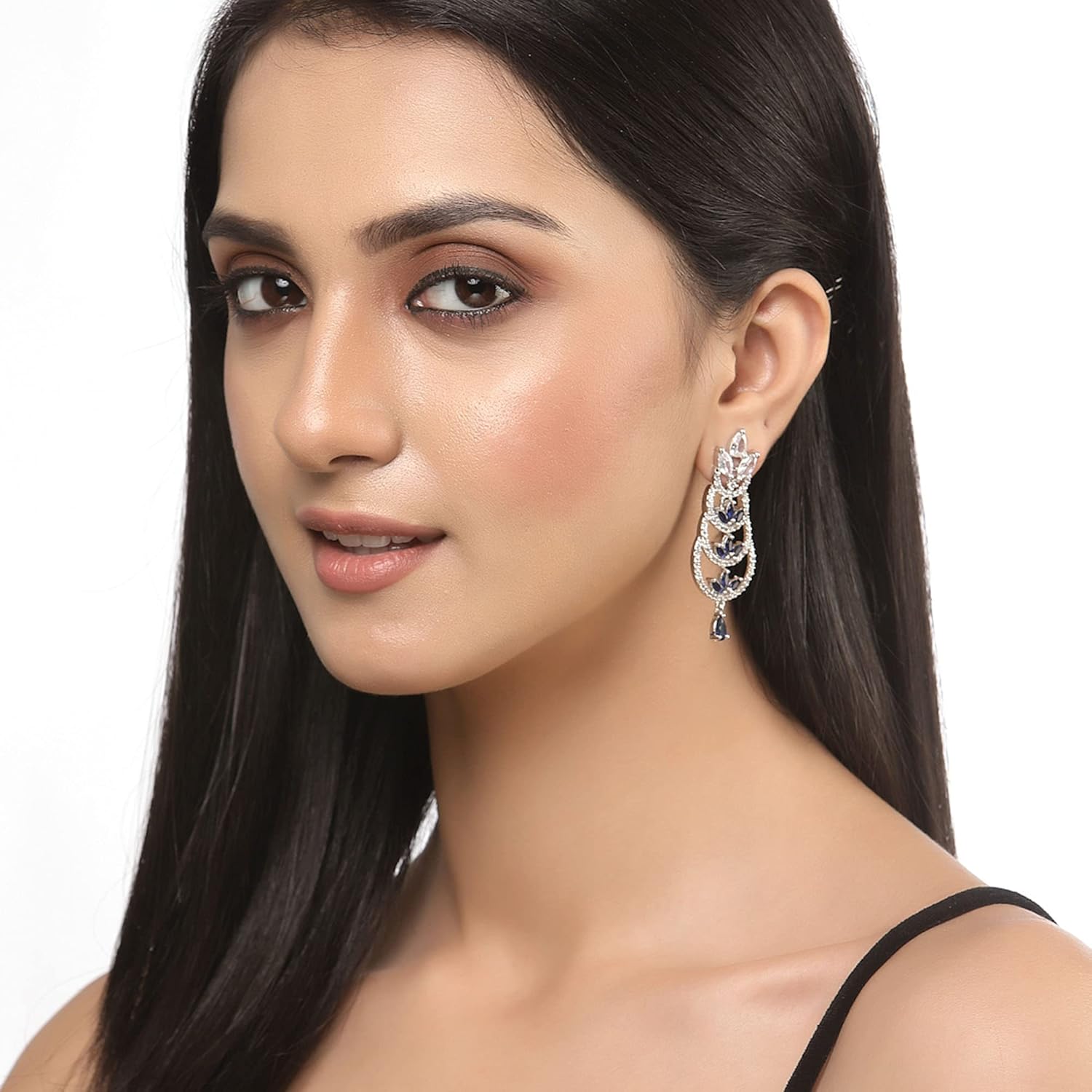 Zeneme Oxidised Silver-Plated American Diamond studded Crescent Drop Earrings for Girls and Women