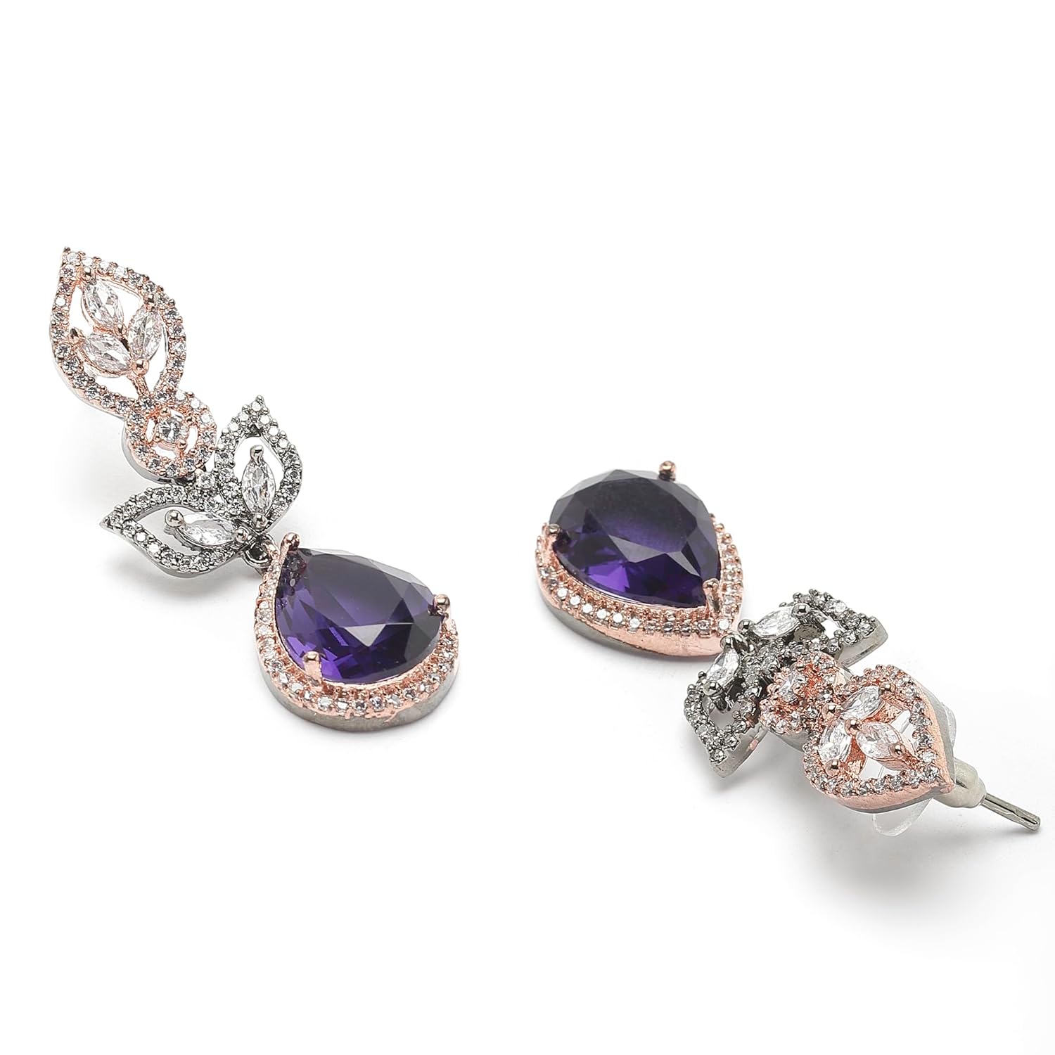 ZENEME Rhodium-Plated American Diamond Studded Teardrop & Leaf Shaped Handcrafted Drop Earrings For Girls and Women