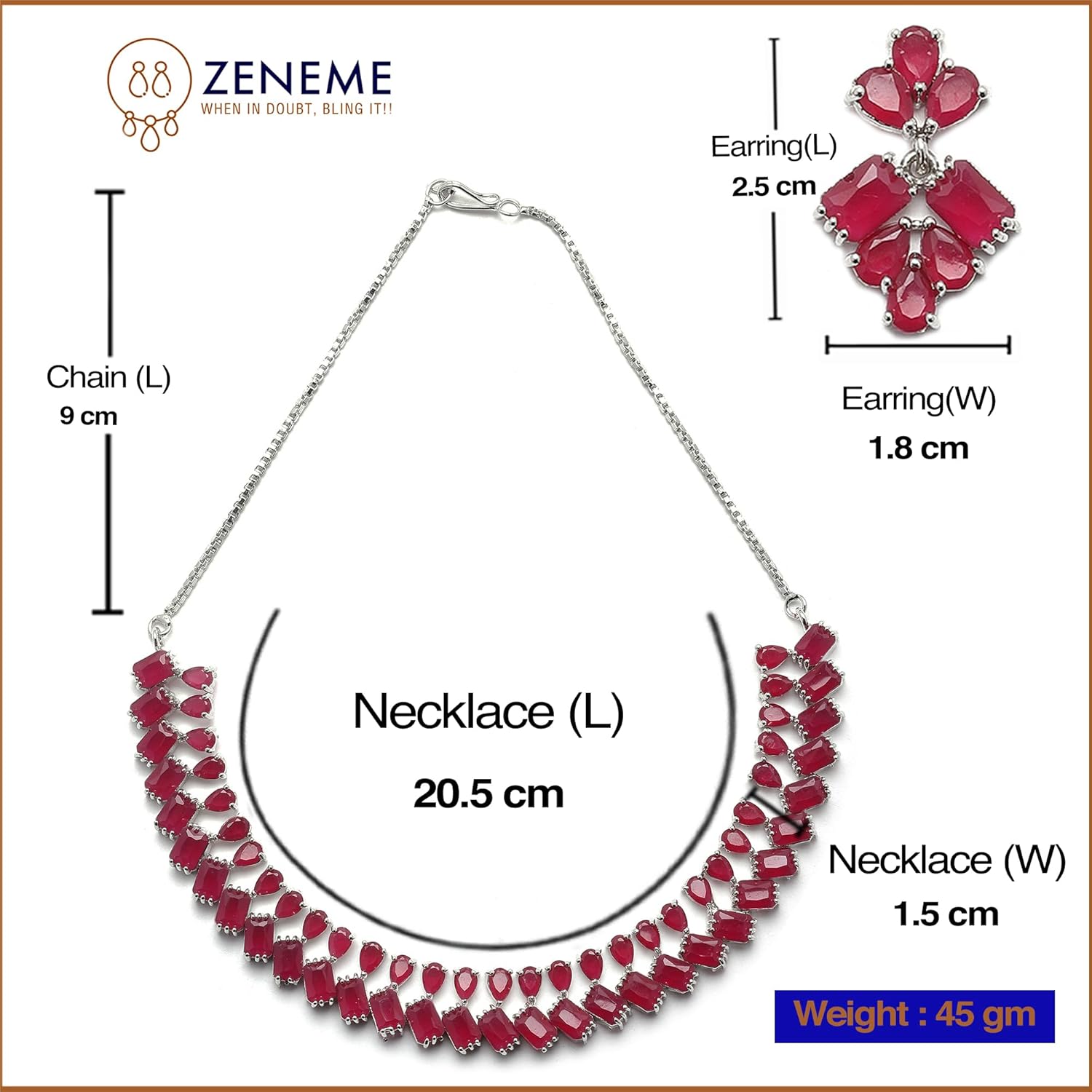 ZENEME Rhodium-Plated Silver Toned Pear Shaped American Diamond Studded Necklace with Earrings Jewellery Set with Girls and Women