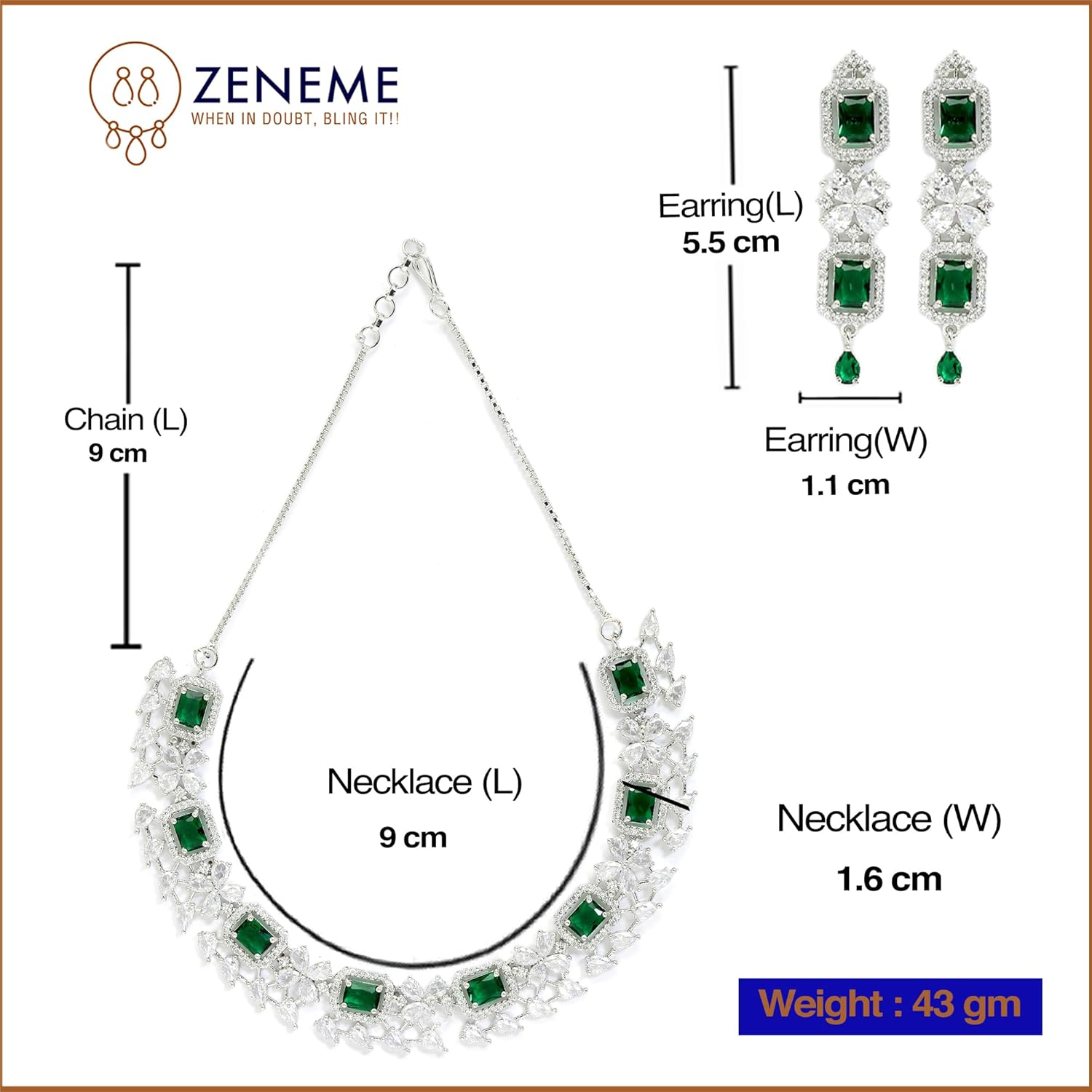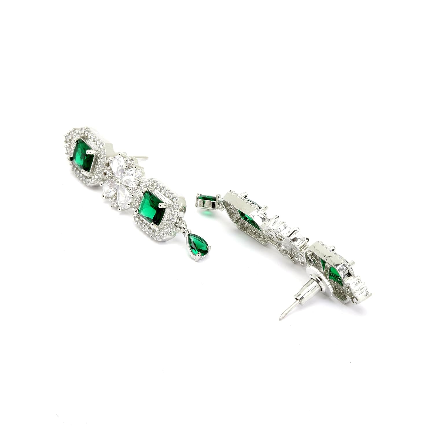 Zeneme Rhodium-Plated With Silver-Toned Green And White American Diamond Studded Necklace And Earrings Jewellery Set For Women