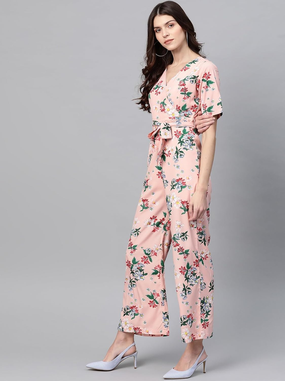Zima Leto Women’s Pink Floral Jumpsuit | V-Neck Overlap Design with Half Sleeves & Tie Belt | Stylish Summer Jumpsuit for Women Casual, Beach, Brunch, Vacation, Party & Cocktail Outfits