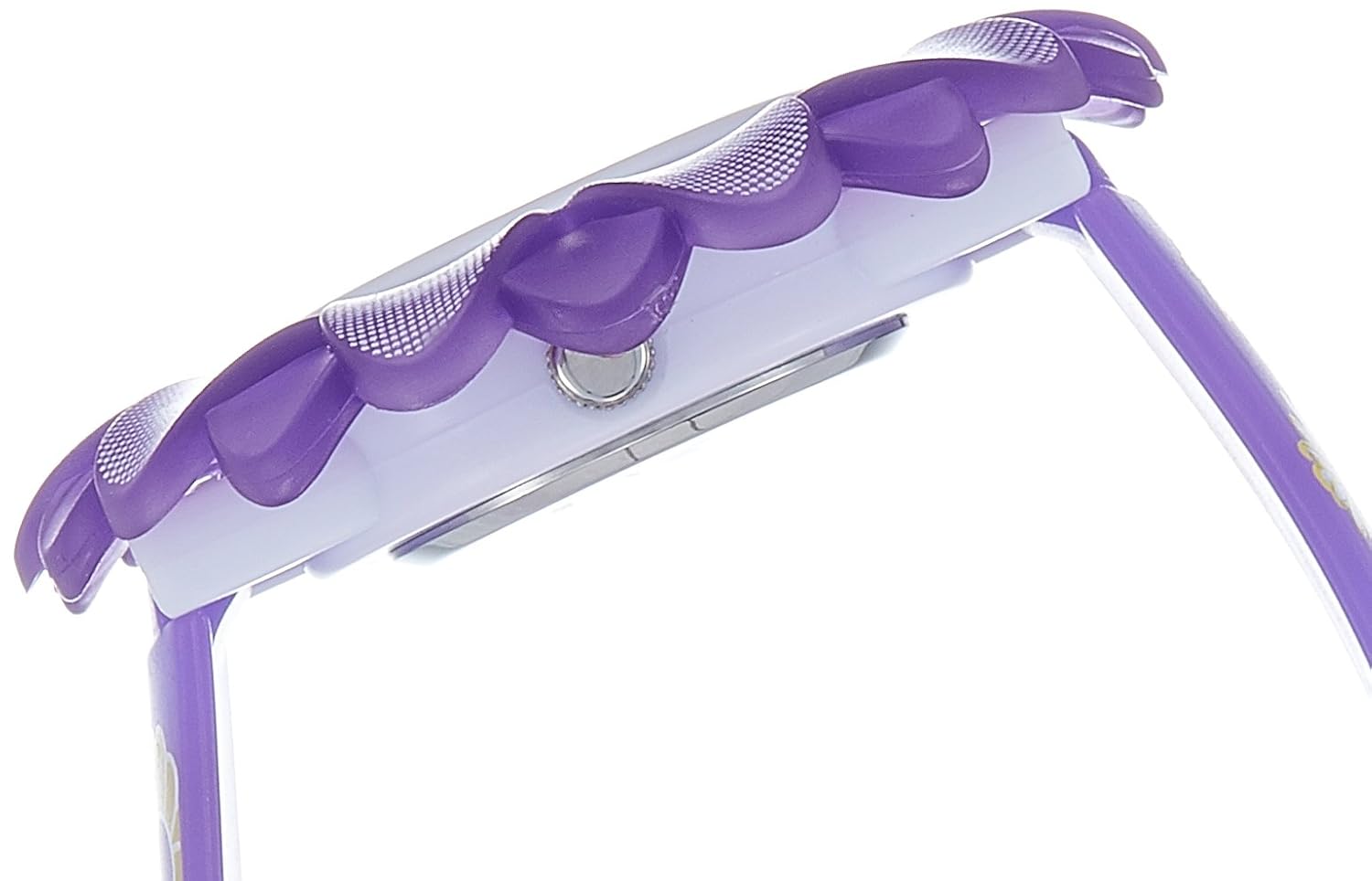 Brighten up your child’s day with this playful Zoop watch, designed in a charming floral theme. The round silver dial is housed within a vibrant purple, translucent flower-shaped case that makes time-telling fun and stylish. It features bold Arabic numerals and colorful hands-purple for hours and yellow for minutes-making it easy for kids to read the time. The purple strap with cheerful daisy prints adds a delightful touch, while the durable polyurethane material ensures a secure and comfortable fit.