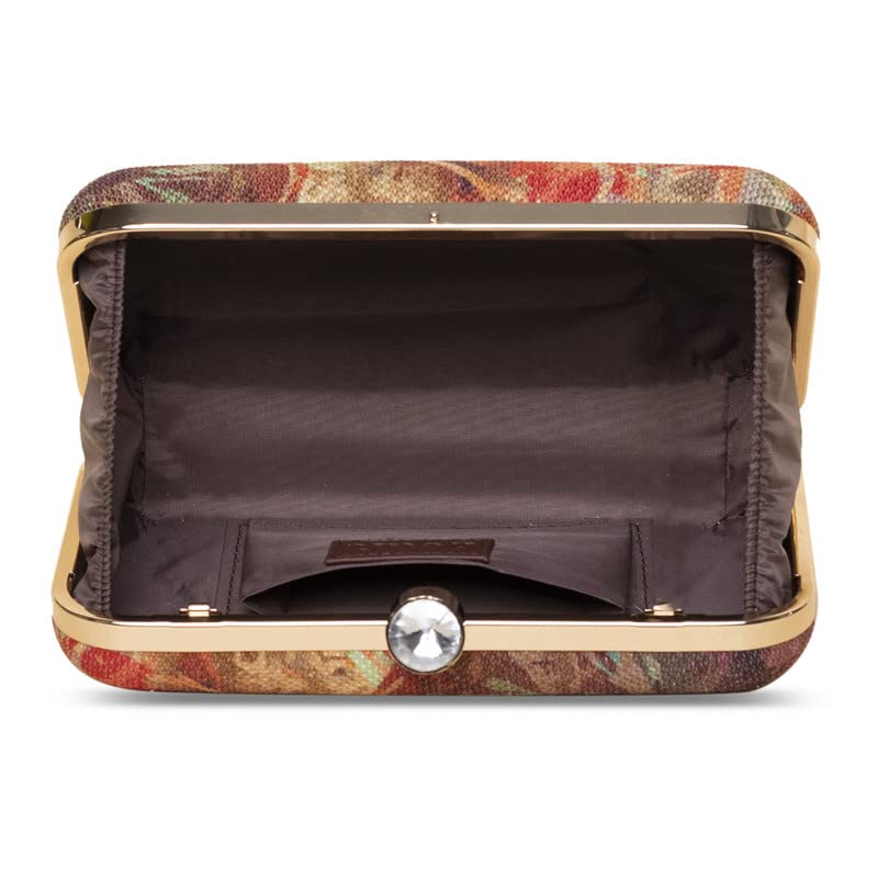 This is a Proudly Indian and 100% PETA approved Vegan Clutch. Crafted in our most elegant prints on jute khadi fabric / Mashru silk, this clutch is a must have in your closet to elevate your festive ethnic wear or evening wear. Embellished with gold – toned frames, it also comes with a detachable golden chain to carry it on your shoulders. It has a main compartment with a click closure. It also has a slip pocket on the inside to keep your small belongings safe and handy.